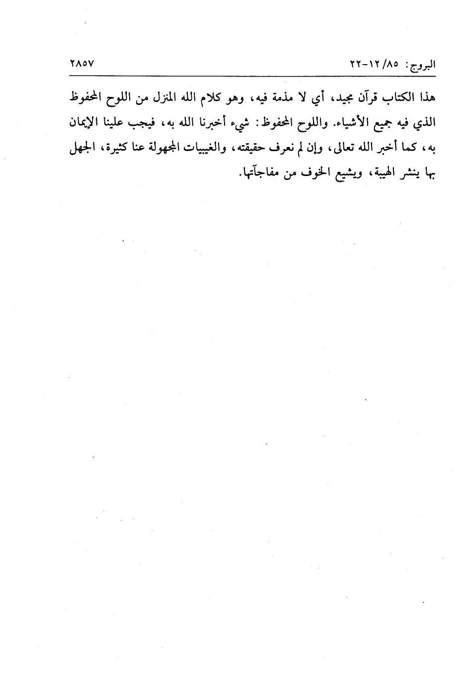 هذا الكتاب قرآن مجيد، أي لا مذمة فيه، وهو كلام الله المنزل من اللوح المحفوظ الذي فيه جميع الأشياء. واللوح المحفوظ: شيء أخبرنا الله به، فيجب علينا الإيمان به، كما أخبر الله تعالى، وإن لم نعرف حقيقته، والغيبيات المجهولة عنا كثيرة، الجهل بها ينشر الهيبة، ويشيع الخوف من مفاجآتها.