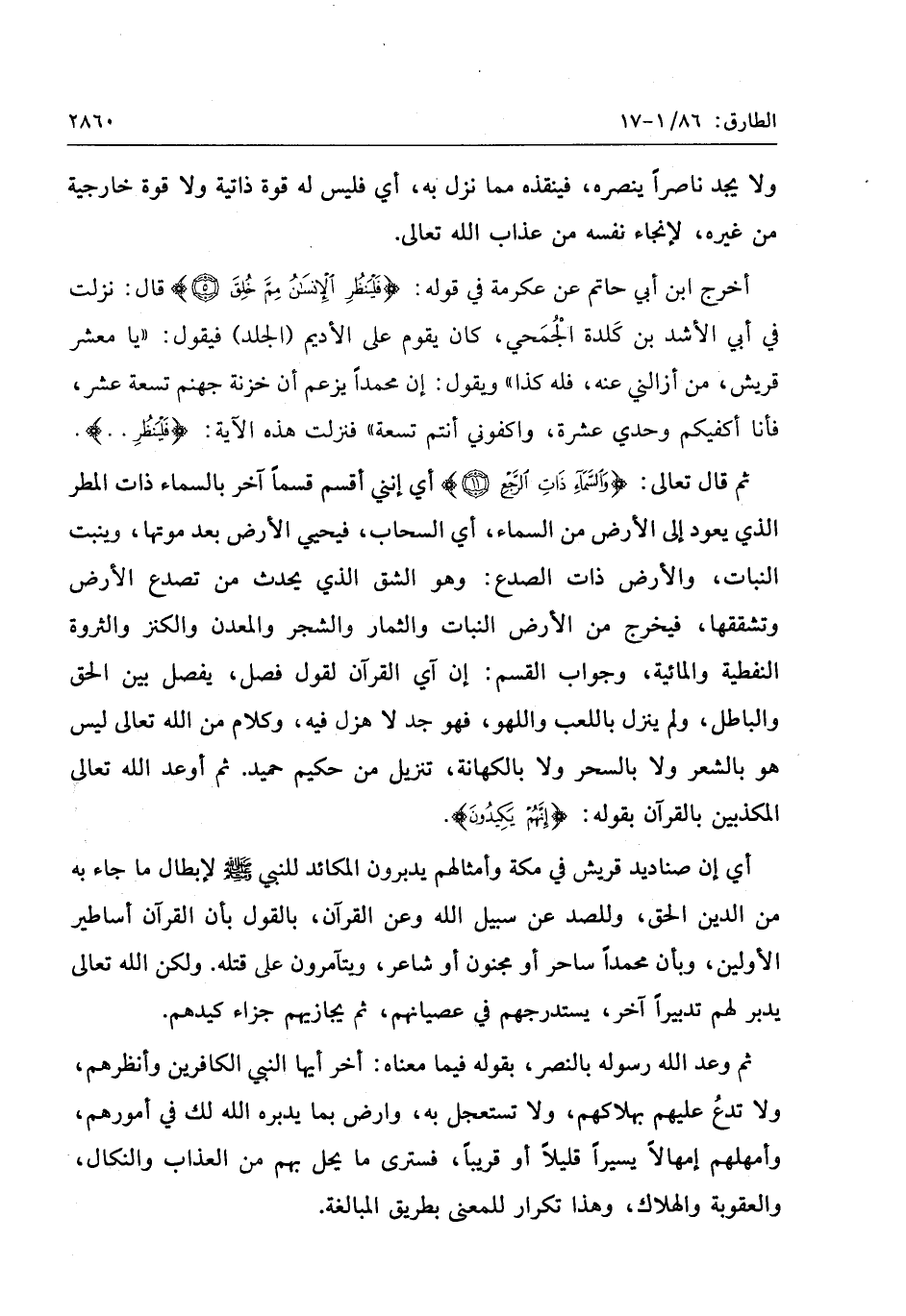 أخرج ابن أبي حاتم عن عكرمة في قوله: فَلْيَنْظُرِ الْإِنْسانُ مِمَّ خُلِقَ (5) قال: نزلت في أبي الأشد بن كلدة الجمحي، كان يقوم على الأديم (الجلد) فيقول: «يا معشر قريش، من أزالني عنه، فله كذا» ويقول: إن محمدا يزعم أن خزنة جهنم تسعة عشر، فأنا أكفيكم وحدي عشرة، واكفوني أنتم تسعة» فنزلت هذه الآية: فَلْيَنْظُرِ ...