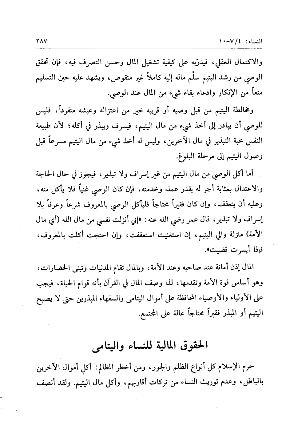 المال إذن أمانة عند صاحبه وعند الأمة، وبالمال تقام المدنيات وتبنى الحضارات، وهو أساس قوة الأمة وتقدمها، لذا وصف المال في القرآن بأنه قوام الحياة، فيجب على الأولياء والأوصياء والمحافظة على أموال اليتامى والسفهاء المبذرين حتى لا يصبح اليتيم أو المبذر فقيرا محتاجا عالة على المجتمع.