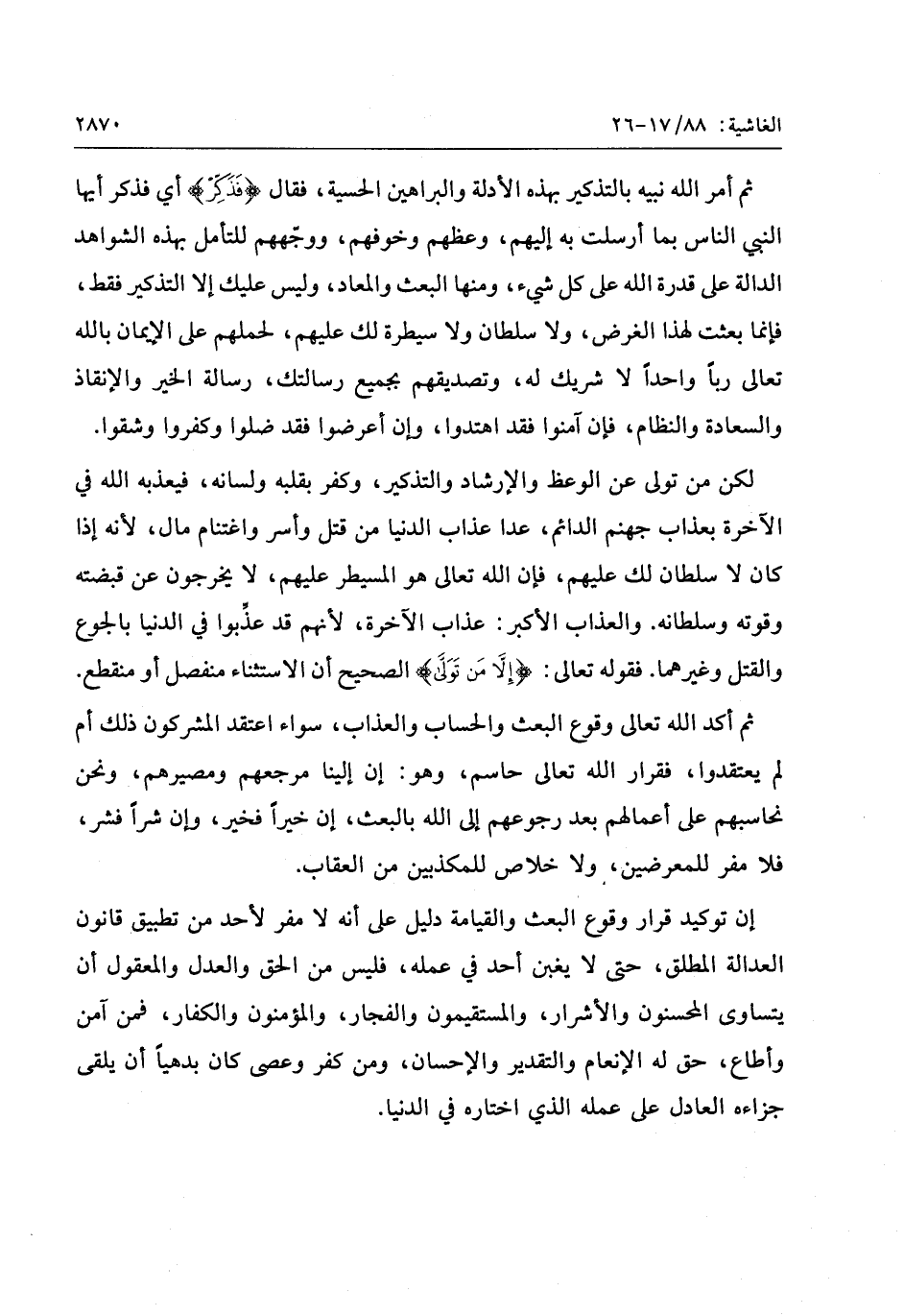 إن توكيد قرار وقوع البعث والقيامة دليل على أنه لا مفر لأحد من تطبيق قانون العدالة المطلق، حتى لا يغبن أحد في عمله، فليس من الحق والعدل والمعقول أن يتساوى المحسنون والأشرار، والمستقيمون والفجار، والمؤمنون والكفار، فمن آمن وأطاع، حق له الإنعام والتقدير والإحسان، ومن كفر وعصى كان بدهيا أن يلقى جزاءه العادل على عمله الذي اختاره في الدنيا.