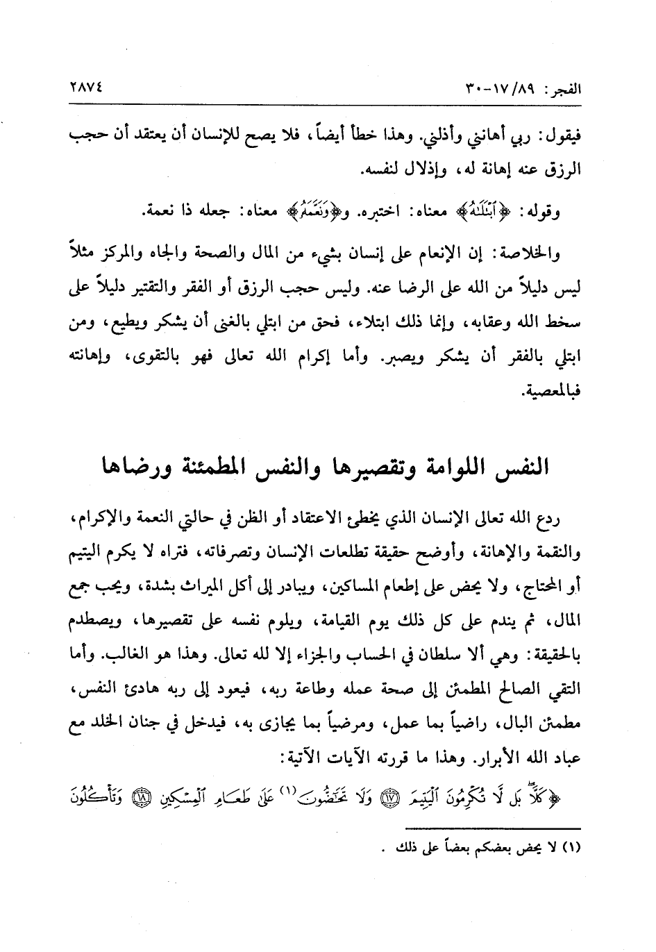 ردع الله تعالى الإنسان الذي يخطئ الاعتقاد أو الظن في حالتي النعمة والإكرام، والنقمة والإهانة، وأوضح حقيقة تطلعات الإنسان وتصرفاته، فتراه لا يكرم اليتيم أو المحتاج، ولا يحض على إطعام المساكين، ويبادر إلى أكل الميراث بشدة، ويحب جمع المال، ثم يندم على كل ذلك يوم القيامة، ويلوم نفسه على تقصيرها، ويصطدم بالحقيقة: وهي ألا سلطان في الحساب والجزاء إلا لله تعالى. وهذا هو الغالب. وأما التقي الصالح المطمئن إلى صحة عمله وطاعة ربه، فيعود إلى ربه هادئ النفس، مطمئن البال، راضيا بما عمل، ومرضيا بما يجازى به، فيدخل في جنان الخلد مع عباد الله الأبرار. وهذا ما قررته الآيات الآتية: