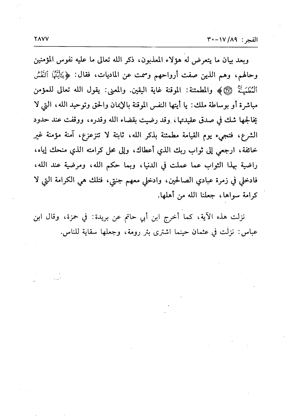 وبعد بيان ما يتعرض له هؤلاء المعذبون، ذكر الله تعالى ما عليه نفوس المؤمنين وحالهم، وهم الذين صفت أرواحهم وسمت عن الماديات، فقال: يا أَيَّتُهَا النَّفْسُ الْمُطْمَئِنَّةُ (27) والمطمئنة: الموقنة غاية اليقين. والمعنى: يقول الله تعالى للمؤمن مباشرة أو بوساطة ملك: يا أيتها النفس الموقنة بالإيمان والحق وتوحيد الله، التي لا يخالجها شك في صدق عقيدتها، وقد رضيت بقضاء الله وقدره، ووقفت عند حدود الشرع، فتجيء يوم القيامة مطمئنة بذكر الله، ثابتة لا تتزعزع، آمنة مؤمنة غير خائفة، ارجعي إلى ثواب ربك الذي أعطاك، وإلى محل كرامته الذي منحك إياه، راضية بهذا الثواب عما عملت في الدنيا، وبما حكم الله، ومرضية عند الله، فادخلي في زمرة عبادي الصالحين، وادخلي معهم جنتي، فتلك هي الكرامة التي لا كرامة سواها، جعلنا الله من أهلها.