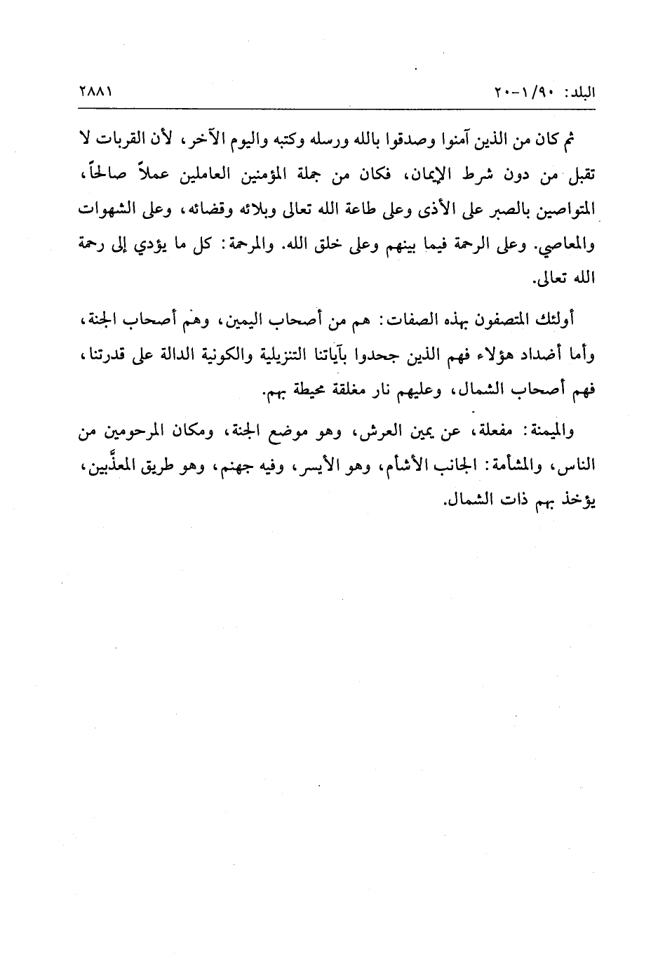 ثم كان من الذين آمنوا وصدقوا بالله ورسله وكتبه واليوم الآخر، لأن القربات لا تقبل من دون شرط الإيمان، فكان من جملة المؤمنين العاملين عملا صالحا، المتواصين بالصبر على الأذى وعلى طاعة الله تعالى وبلائه وقضائه، وعلى الشهوات والمعاصي. وعلى الرحمة فيما بينهم وعلى خلق الله. والمرحمة: كل ما يؤدي إلى رحمة الله تعالى.