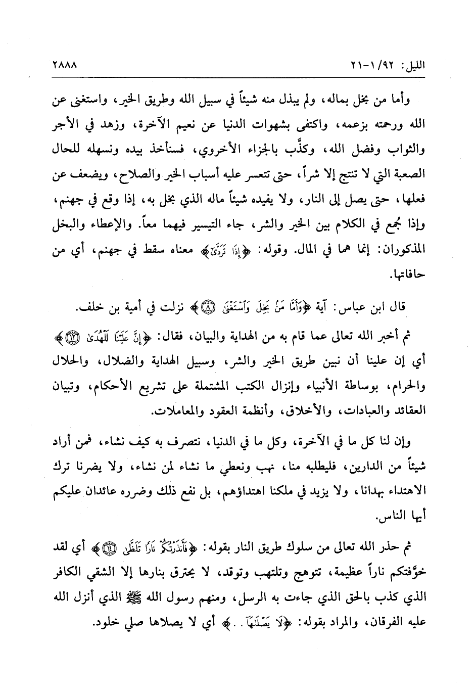 وأما من بخل بماله، ولم يبذل منه شيئا في سبيل الله وطريق الخير، واستغنى عن الله ورحمته بزعمه، واكتفى بشهوات الدنيا عن نعيم الآخرة، وزهد في الأجر والثواب وفضل الله، وكذّب بالجزاء الأخروي، فسنأخذ بيده ونسهله للحال الصعبة التي لا تنتج إلا شرا، حتى تتعسر عليه أسباب الخير والصلاح، ويضعف عن فعلها، حتى يصل إلى النار، ولا يفيده شيئا ماله الذي بخل به، إذا وقع في جهنم، وإذا جمع في الكلام بين الخير والشر، جاء التيسير فيهما معا. والإعطاء والبخل المذكوران: إنما هما في المال. وقوله: إِذا تَرَدَّى معناه سقط في جهنم، أي من حافاتها.