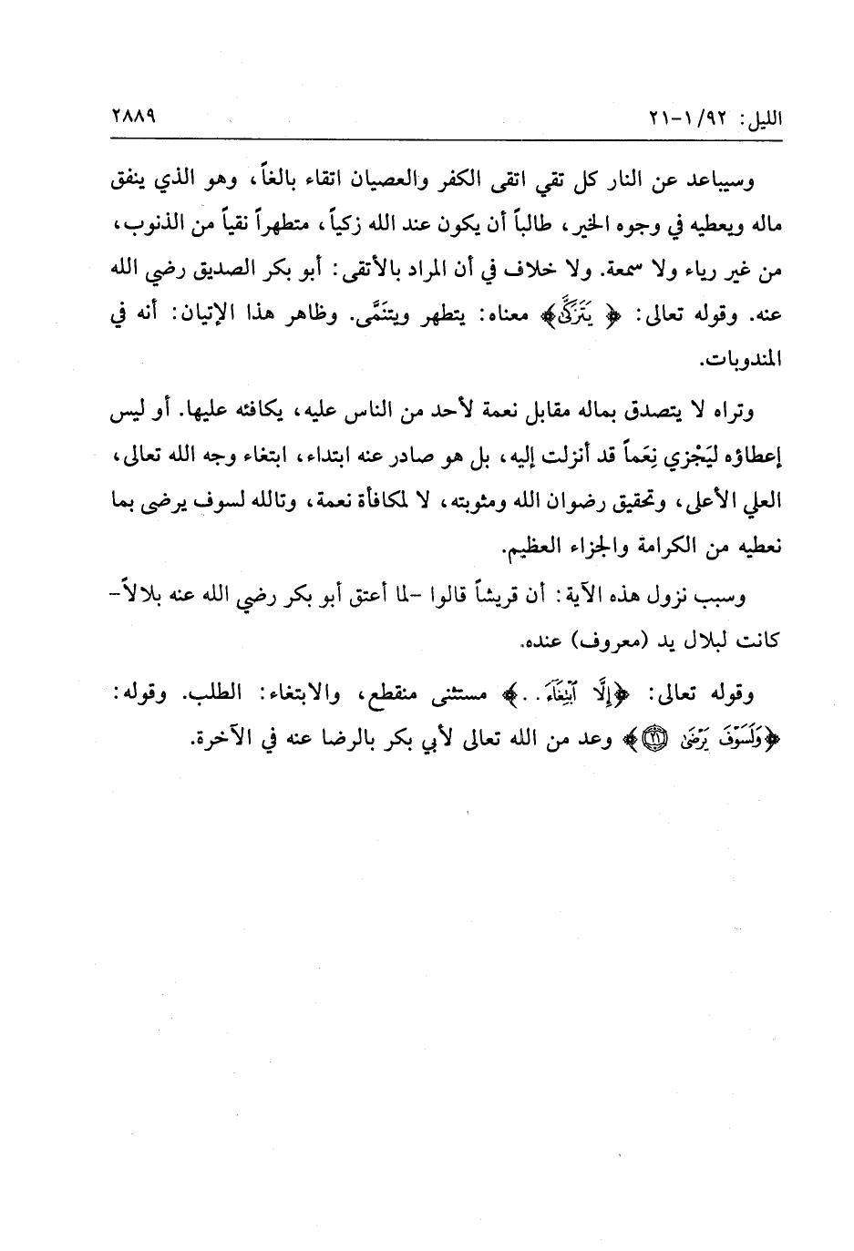 وتراه لا يتصدق بماله مقابل نعمة لأحد من الناس عليه، يكافئه عليها. أو ليس إعطاؤه ليجزي نعما قد أنزلت إليه، بل هو صادر عنه ابتداء، ابتغاء وجه الله تعالى، العلي الأعلى، وتحقيق رضوان الله ومثوبته، لا لمكافأة نعمة، وتالله لسوف يرضى بما نعطيه من الكرامة والجزاء العظيم.