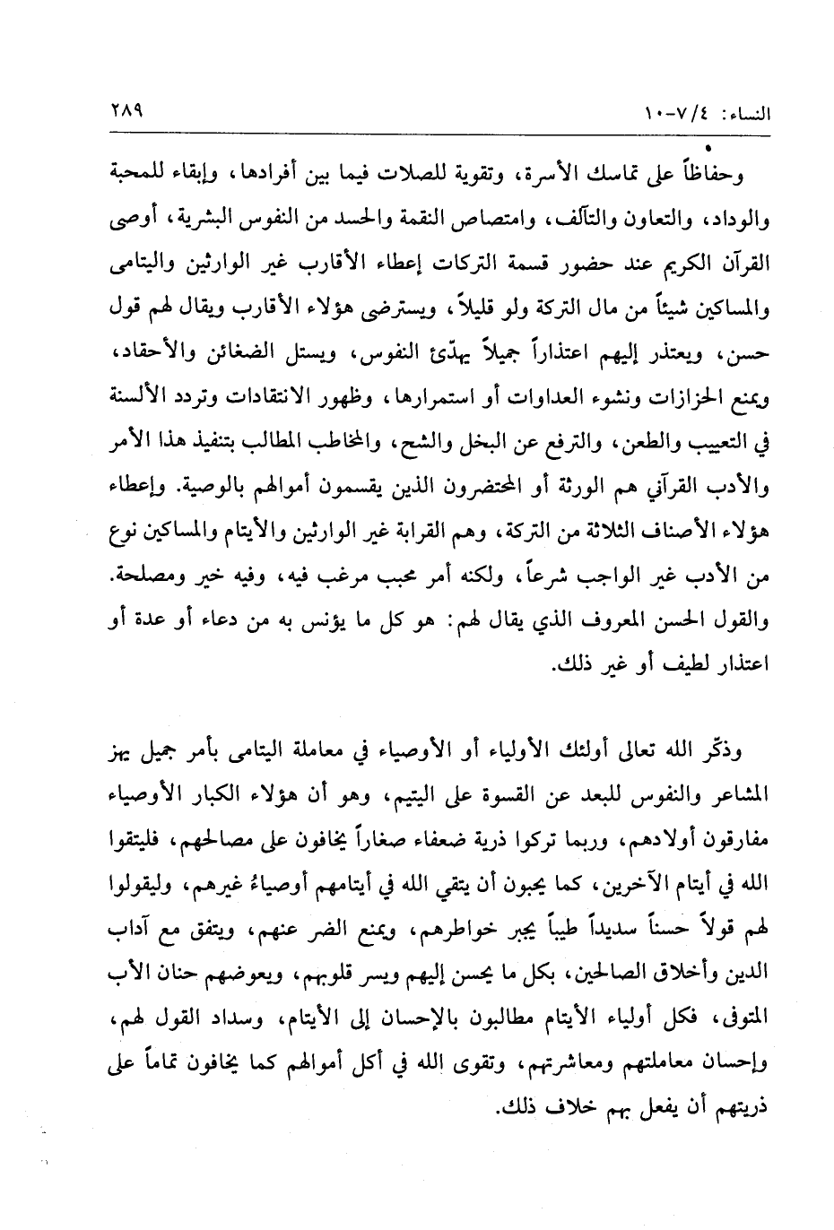 وحفاظا على تماسك الأسرة، وتقوية للصلات فيما بين أفرادها، وإبقاء للمحبة والوداد، والتعاون والتآلف، وامتصاص النقمة والحسد من النفوس البشرية، أوصى القرآن الكريم عند حضور قسمة التركات إعطاء الأقارب غير الوارثين واليتامى والمساكين شيئا من مال التركة ولو قليلا، ويسترضى هؤلاء الأقارب ويقال لهم قول حسن، ويعتذر إليهم اعتذارا جميلا يهدّئ النفوس، ويستل الضغائن والأحقاد، ويمنع الحزازات ونشوء العداوات أو استمرارها، وظهور الانتقادات وتردد الألسنة في التعييب والطعن، والترفع عن البخل والشح، والمخاطب المطالب بتنفيذ هذا الأمر والأدب القرآني هم الورثة أو المحتضرون الذين يقسمون أموالهم بالوصية. وإعطاء هؤلاء الأصناف الثلاثة من التركة، وهم القرابة غير الوارثين والأيتام والمساكين نوع من الأدب غير الواجب شرعا، ولكنه أمر محبب مرغب فيه، وفيه خير ومصلحة.