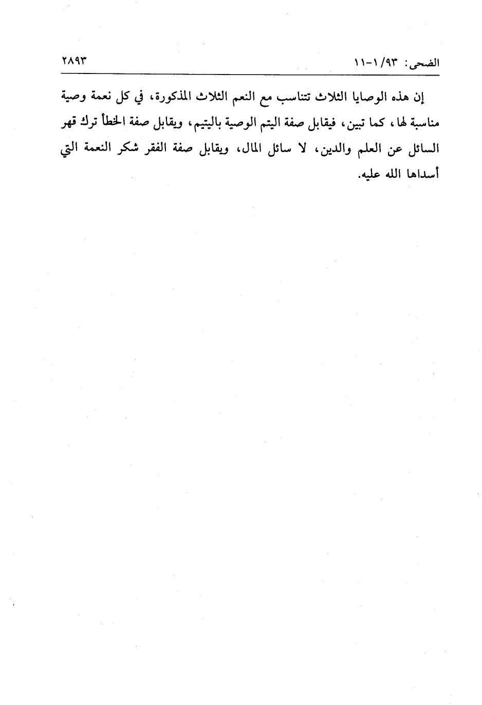 إن هذه الوصايا الثلاث تتناسب مع النعم الثلاث المذكورة، في كل نعمة وصية مناسبة لها، كما تبين، فيقابل صفة اليتم الوصية باليتيم، ويقابل صفة الخطأ ترك قهر السائل عن العلم والدين، لا سائل المال، ويقابل صفة الفقر شكر النعمة التي أسداها الله عليه.