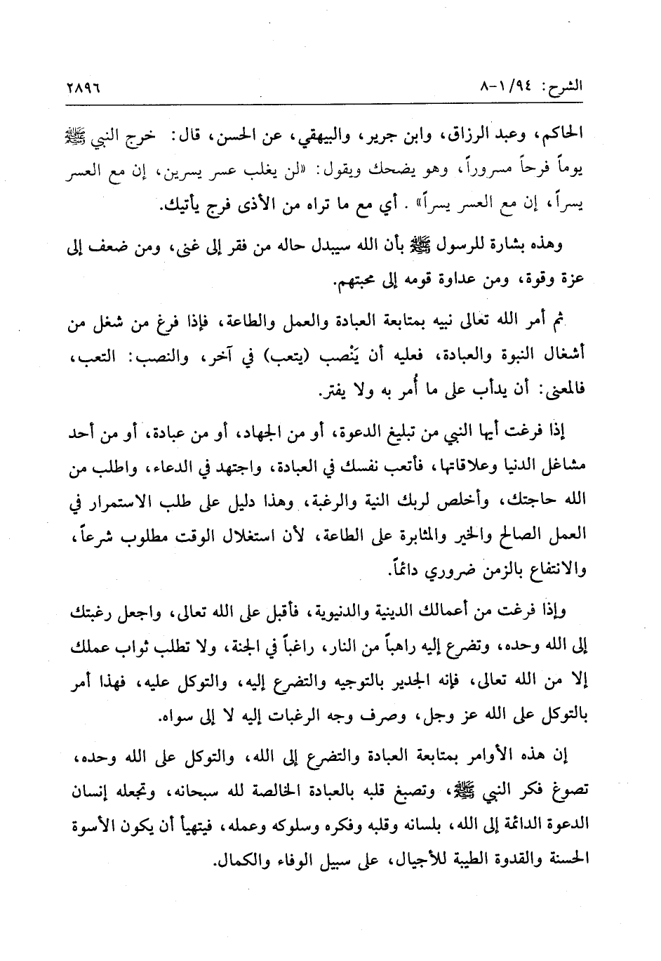 إذا فرغت أيها النبي من تبليغ الدعوة، أو من الجهاد، أو من عبادة، أو من أحد مشاغل الدنيا وعلاقاتها، فأتعب نفسك في العبادة، واجتهد في الدعاء، واطلب من الله حاجتك، وأخلص لربك النية والرغبة، وهذا دليل على طلب الاستمرار في العمل الصالح والخير والمثابرة على الطاعة، لأن استغلال الوقت مطلوب شرعا، والانتفاع بالزمن ضروري دائما.