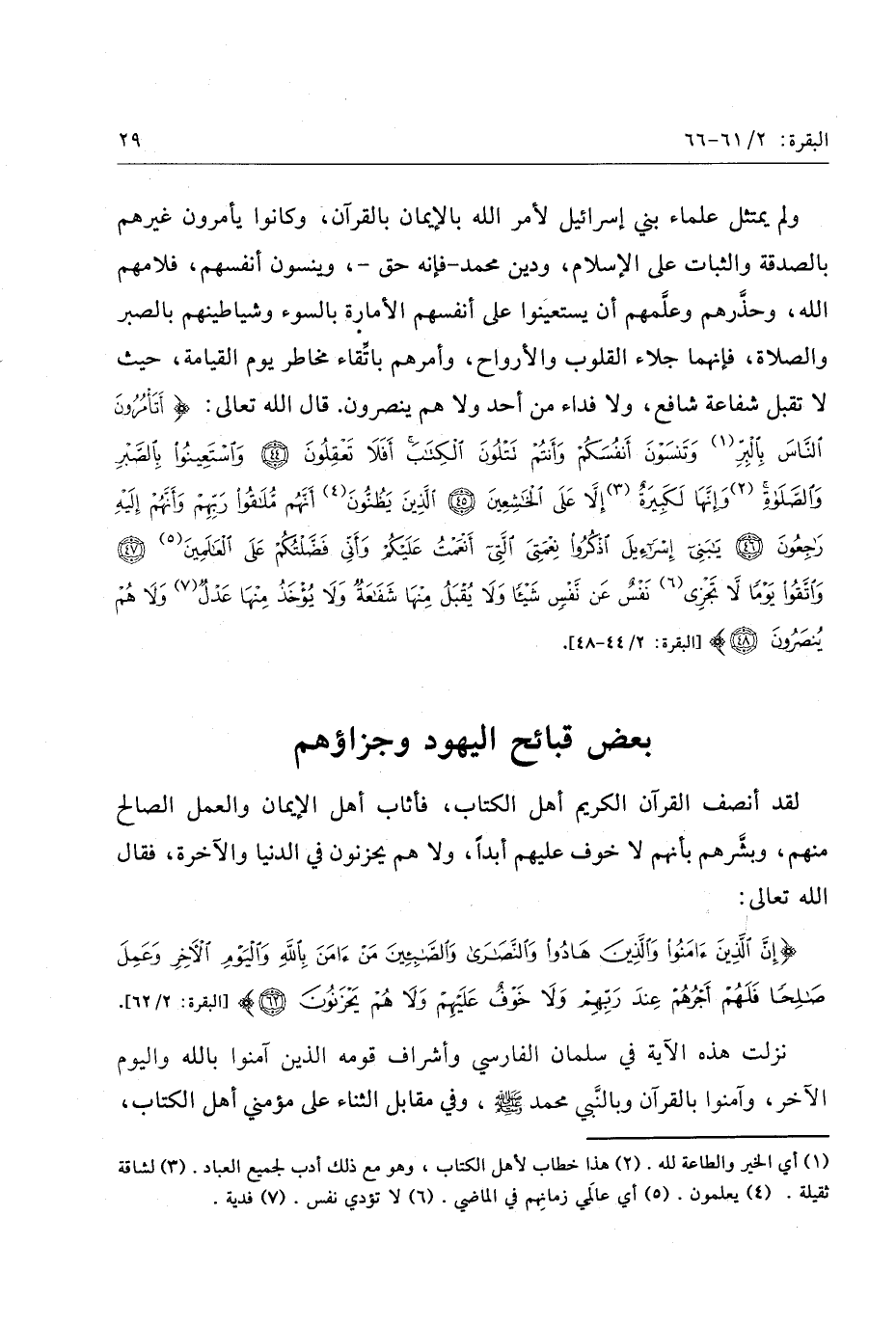ولم يمتثل علماء بني إسرائيل لأمر الله بالإيمان بالقرآن، وكانوا يأمرون غيرهم بالصدقة والثبات على الإسلام، ودين محمد- فإنه حق-، وينسون أنفسهم، فلامهم الله، وحذّرهم وعلّمهم أن يستعينوا على أنفسهم الأمارة بالسوء وشياطينهم بالصبر والصلاة، فإنهما جلاء القلوب والأرواح، وأمرهم باتّقاء مخاطر يوم القيامة، حيث لا تقبل شفاعة شافع، ولا فداء من أحد ولا هم ينصرون. قال الله تعالى: أَتَأْمُرُونَ النَّاسَ بِالْبِرِّ «1» وَتَنْسَوْنَ أَنْفُسَكُمْ وَأَنْتُمْ تَتْلُونَ الْكِتابَ أَفَلا تَعْقِلُونَ (44) وَاسْتَعِينُوا بِالصَّبْرِ وَالصَّلاةِ «2» وَإِنَّها لَكَبِيرَةٌ «3» إِلَّا عَلَى الْخاشِعِينَ (45) الَّذِينَ يَظُنُّونَ «4» أَنَّهُمْ مُلاقُوا رَبِّهِمْ وَأَنَّهُمْ إِلَيْهِ راجِعُونَ (46) يا بَنِي إِسْرائِيلَ اذْكُرُوا نِعْمَتِيَ الَّتِي أَنْعَمْتُ عَلَيْكُمْ وَأَنِّي فَضَّلْتُكُمْ عَلَى الْعالَمِينَ «5» (47) وَاتَّقُوا يَوْماً لا تَجْزِي «6» نَفْسٌ عَنْ نَفْسٍ شَيْئاً وَلا يُقْبَلُ مِنْها شَفاعَةٌ وَلا يُؤْخَذُ مِنْها عَدْلٌ «7» وَلا هُمْ يُنْصَرُونَ (48) [البقرة: 2/ 44- 48]