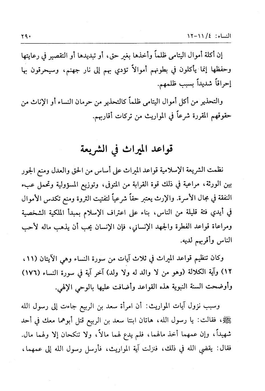 وكان تنظيم قواعد الميراث في ثلاث آيات من سورة النساء وهي الآيتان (11، 12) وآية الكلالة (وهو من لا والد له ولا ولد) آخر آية في سورة النساء (176) وأوضحت السنة النبوية هذه القواعد وأضافت عليها بالوحي الإلهي.