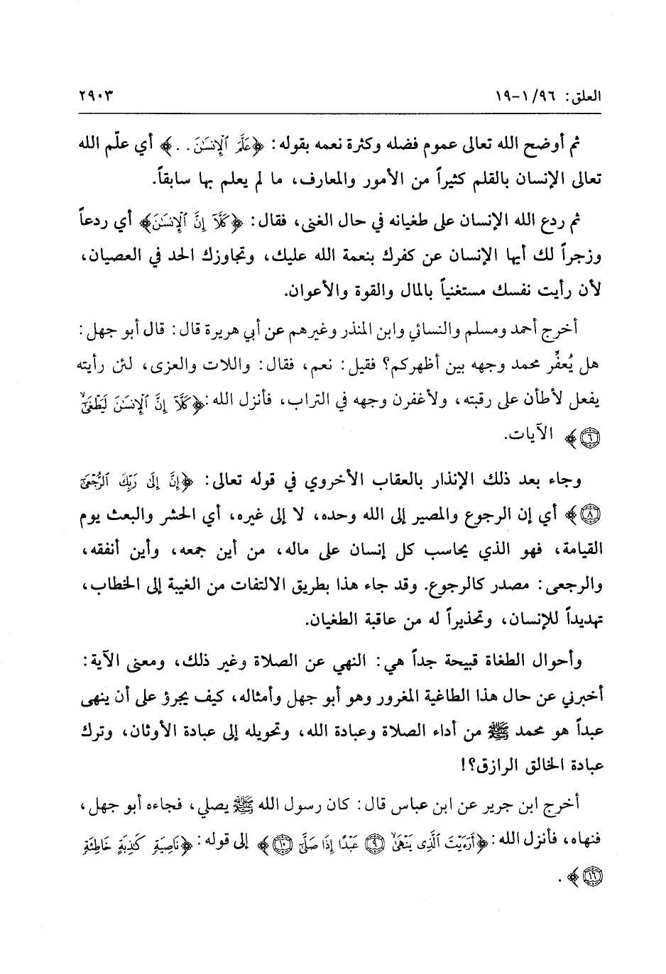 هل يعفّر محمد وجهه بين أظهركم؟ فقيل: نعم، فقال: واللات والعزى، لئن رأيته يفعل لأطأن على رقبته، ولأغفرن وجهه في التراب، فأنزل الله: كَلَّا إِنَّ الْإِنْسانَ لَيَطْغى (6) الآيات.