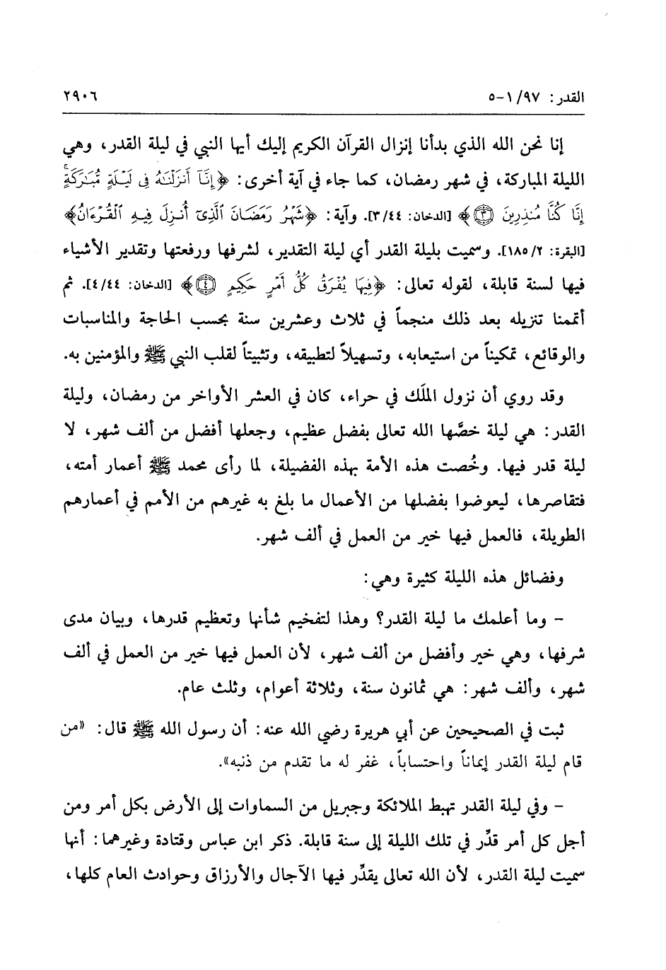إنا نحن الله الذي بدأنا إنزال القرآن الكريم إليك أيها النبي في ليلة القدر، وهي الليلة المباركة، في شهر رمضان، كما جاء في آية أخرى: إِنَّا أَنْزَلْناهُ فِي لَيْلَةٍ مُبارَكَةٍ إِنَّا كُنَّا مُنْذِرِينَ (3) [الدخان: 44/ 3] . وآية: شَهْرُ رَمَضانَ الَّذِي أُنْزِلَ فِيهِ الْقُرْآنُ [البقرة: 2/ 185] . وسميت بليلة القدر أي ليلة التقدير، لشرفها ورفعتها وتقدير الأشياء فيها لسنة قابلة، لقوله تعالى: فِيها يُفْرَقُ كُلُّ أَمْرٍ حَكِيمٍ (4) [الدخان: 44/ 4] . ثم أتممنا تنزيله بعد ذلك منجما في ثلاث وعشرين سنة بحسب الحاجة والمناسبات والوقائع، تمكينا من استيعابه، وتسهيلا لتطبيقه، وتثبيتا لقلب النبي صلّى الله عليه وسلّم والمؤمنين به.