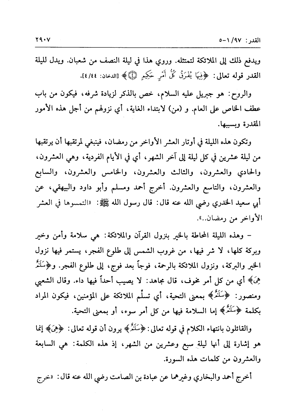- وهذه الليلة المحاطة بالخير بنزول القرآن والملائكة: هي سلامة وأمن وخير وبركة كلها، لا شر فيها، من غروب الشمس إلى طلوع الفجر، يستمر فيها نزول الخير والبركة، ونزول الملائكة بالرحمة، فوجا بعد فوج، إلى طلوع الفجر. وسَلامٌ هِيَ أي من كل أمر مخوف، قال مجاهد: لا يصيب أحدا فيها داء. وقال الشعبي ومنصور: سَلامٌ بمعنى التحية، أي تسلّم الملائكة على المؤمنين، فيكون المراد بكلمة سَلامٌ إما السلامة فيها من كل أمر سوء، أو بمعنى التحية.