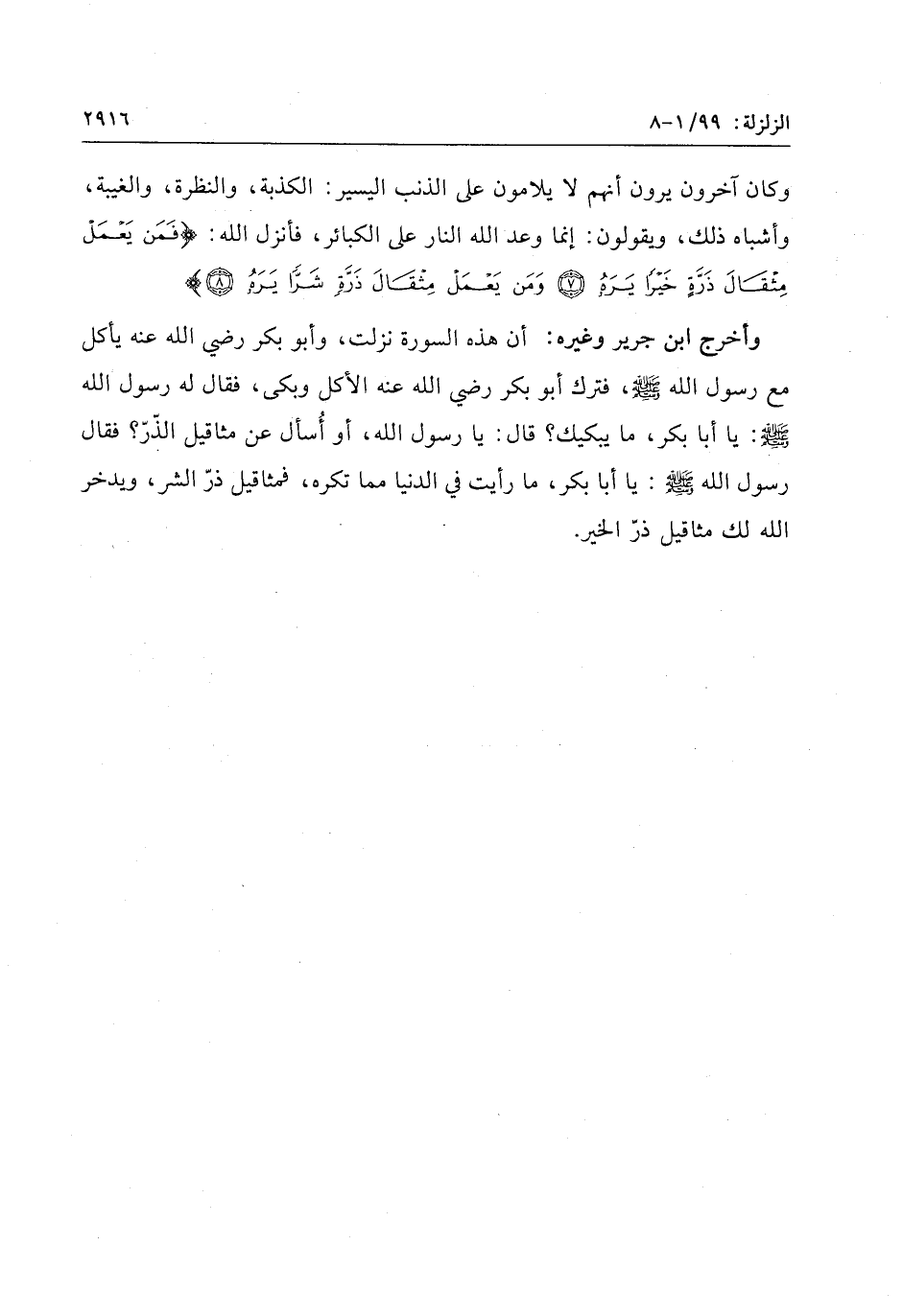 وأخرج ابن جرير وغيره: أن هذه السورة نزلت، وأبو بكر رضي الله عنه يأكل مع رسول الله صلّى الله عليه وسلّم، فترك أبو بكر رضي الله عنه الأكل وبكى، فقال له رسول الله صلّى الله عليه وسلّم: يا أبا بكر، ما يبكيك؟ قال: يا رسول الله، أو أسأل عن مثاقيل الذّرّ؟ فقال رسول الله صلّى الله عليه وسلّم: يا أبا بكر، ما رأيت في الدنيا مما تكره، فمثاقيل ذرّ الشر، ويدخر الله لك مثاقيل ذرّ الخير.