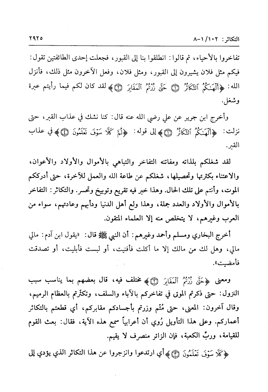 تفاخروا بالأحياء، ثم قالوا: انطلقوا بنا إلى القبور، فجعلت إحدى الطائفتين تقول: