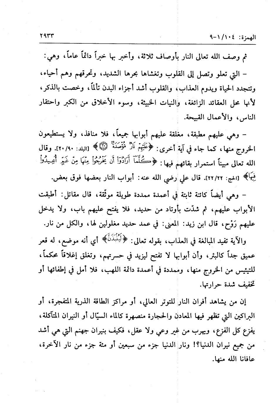 - وهي أيضا كائنة ثابتة في أعمدة ممددة طويلة موثّقة، قال مقاتل: أطبقت الأبواب عليهم، ثم شدّت بأوتاد من حديد، فلا يفتح عليهم باب، ولا يدخل عليهم روح، قال ابن زيد: المعنى: في عمد حديد مغلولين لها، والكل من نار.