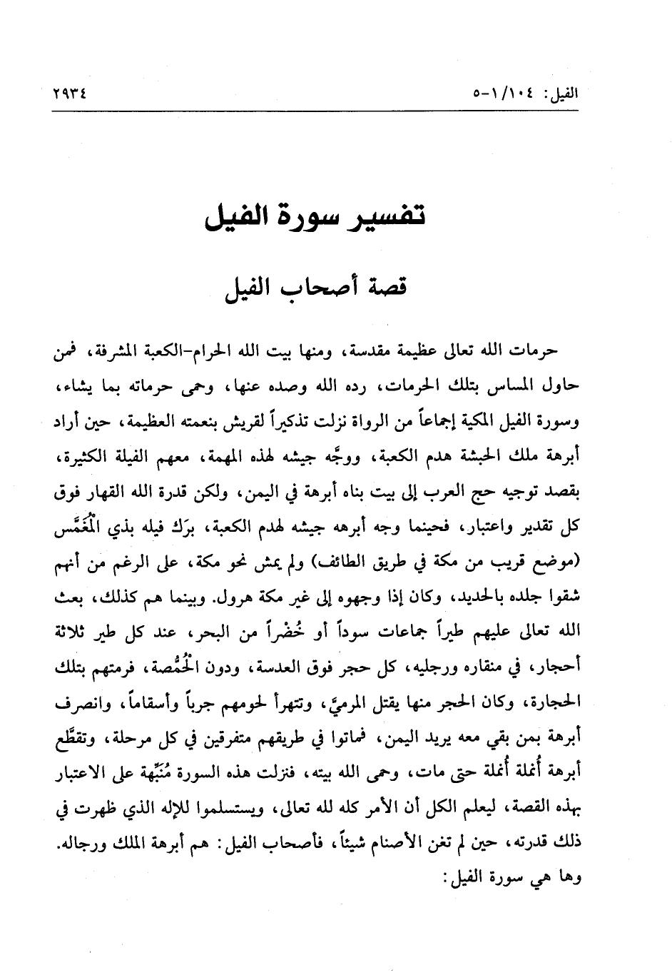 حرمات الله تعالى عظيمة مقدسة، ومنها بيت الله الحرام- الكعبة المشرفة، فمن حاول المساس بتلك الحرمات، رده الله وصده عنها، وحمى حرماته بما يشاء، وسورة الفيل المكية إجماعا من الرواة نزلت تذكيرا لقريش بنعمته العظيمة، حين أراد أبرهة ملك الحبشة هدم الكعبة، ووجّه جيشه لهذه المهمة، معهم الفيلة الكثيرة، بقصد توجيه حج العرب إلى بيت بناه أبرهة في اليمن، ولكن قدرة الله القهار فوق كل تقدير واعتبار، فحينما وجه أبرهه جيشه لهدم الكعبة، برك فيله بذي المغمّس (موضع قريب من مكة في طريق الطائف) ولم يمش نحو مكة، على الرغم من أنهم شقوا جلده بالحديد، وكان إذا وجهوه إلى غير مكة هرول. وبينما هم كذلك، بعث الله تعالى عليهم طيرا جماعات سودا أو خضرا من البحر، عند كل طير ثلاثة أحجار، في منقاره ورجليه، كل حجر فوق العدسة، ودون الحمّصة، فرمتهم بتلك الحجارة، وكان الحجر منها يقتل المرميّ، وتتهرأ لحومهم جربا وأسقاما، وانصرف أبرهة بمن بقي معه يريد اليمن، فماتوا في طريقهم متفرقين في كل مرحلة، وتقطّع أبرهة أنملة أنملة حتى مات، وحمى الله بيته، فنزلت هذه السورة منبّهة على الاعتبار بهذه القصة، ليعلم الكل أن الأمر كله لله تعالى، ويستسلموا للإله الذي ظهرت في ذلك قدرته، حين لم تغن الأصنام شيئا، فأصحاب الفيل: هم أبرهة الملك ورجاله.