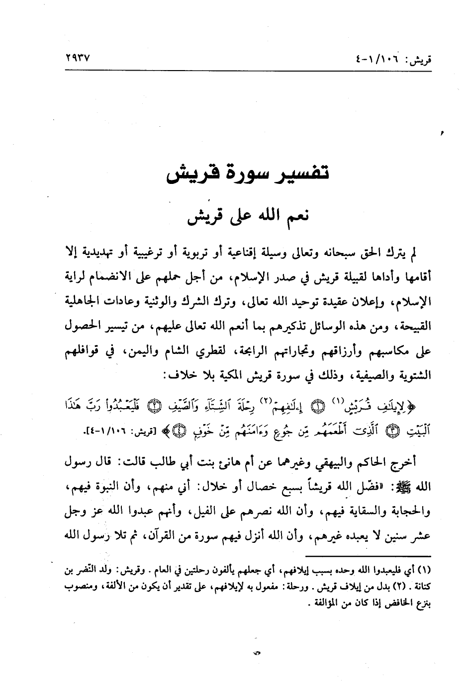لِإِيلافِ قُرَيْشٍ (1) إِيلافِهِمْ رِحْلَةَ الشِّتاءِ وَالصَّيْفِ (2) فَلْيَعْبُدُوا رَبَّ هذَا الْبَيْتِ (3) الَّذِي أَطْعَمَهُمْ مِنْ جُوعٍ وَآمَنَهُمْ مِنْ خَوْفٍ (4)