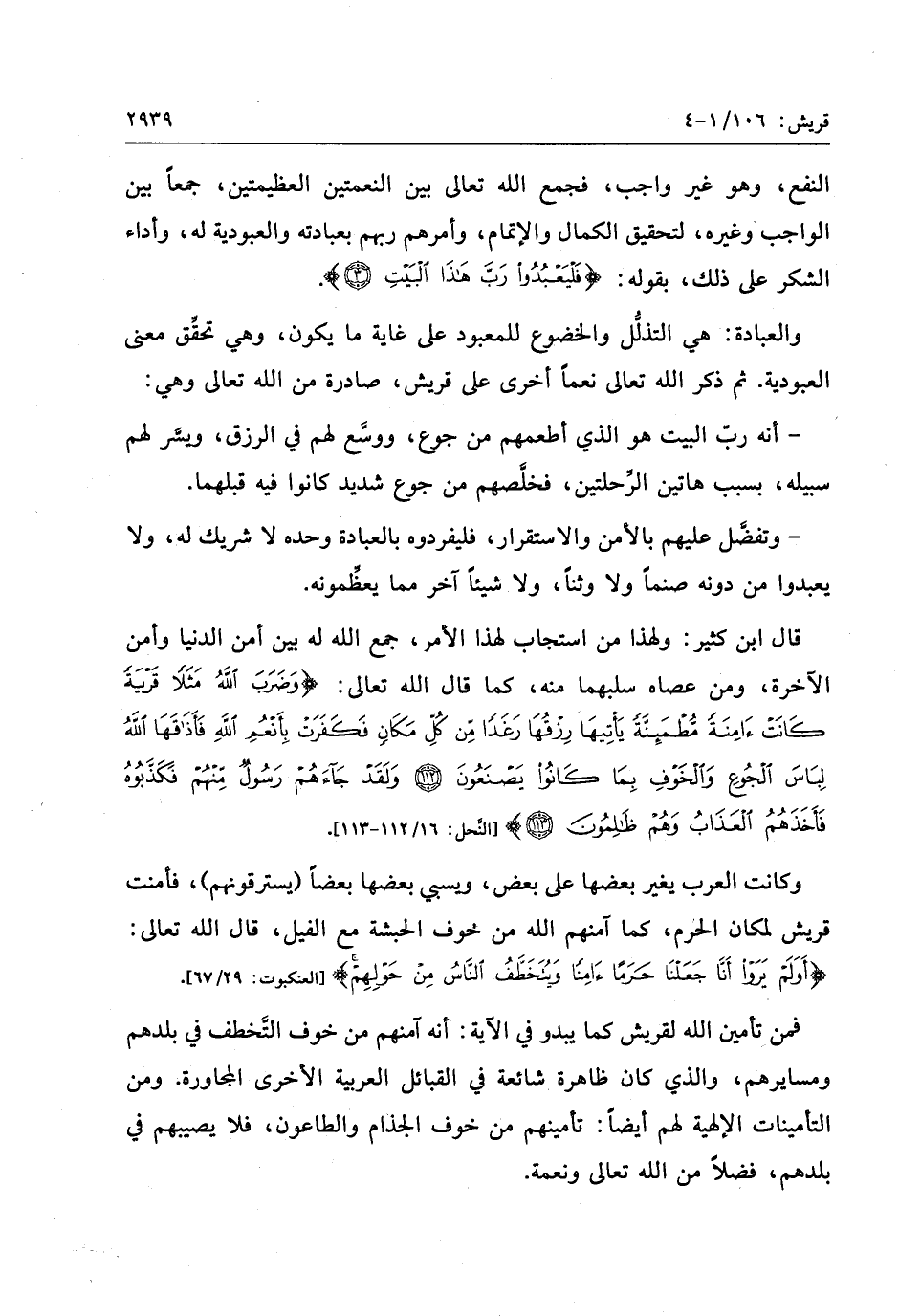 النفع، وهو غير واجب، فجمع الله تعالى بين النعمتين العظيمتين، جمعا بين الواجب وغيره، لتحقيق الكمال والإتمام، وأمرهم ربهم بعبادته والعبودية له، وأداء الشكر على ذلك، بقوله: لْيَعْبُدُوا رَبَّ هذَا الْبَيْتِ