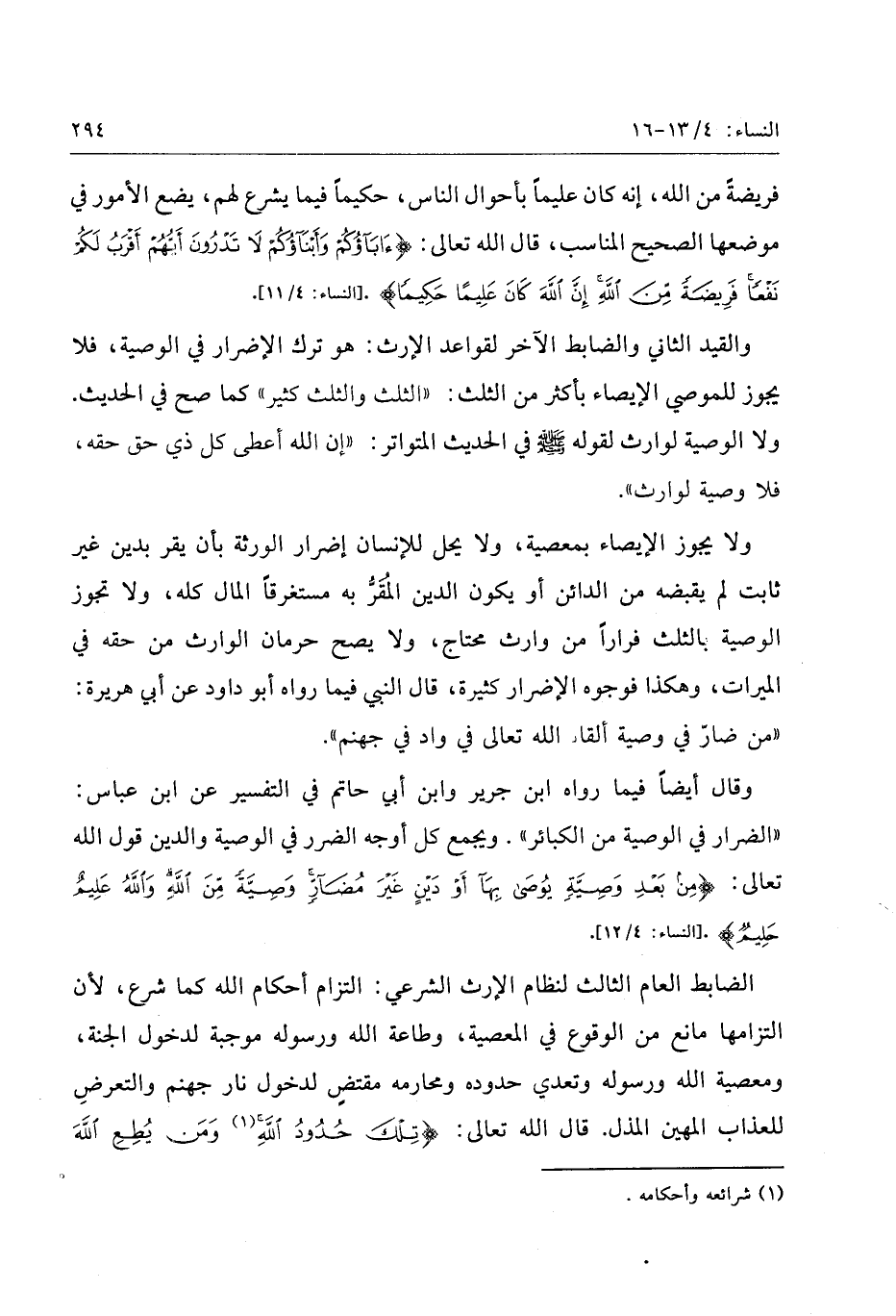 الضابط العام الثالث لنظام الإرث الشرعي: التزام أحكام الله كما شرع، لأن التزامها مانع من الوقوع في المعصية، وطاعة الله ورسوله موجبة لدخول الجنة، ومعصية الله ورسوله وتعدي حدوده ومحارمه مقتض لدخول نار جهنم والتعرض للعذاب المهين المذل. قال الله تعالى: