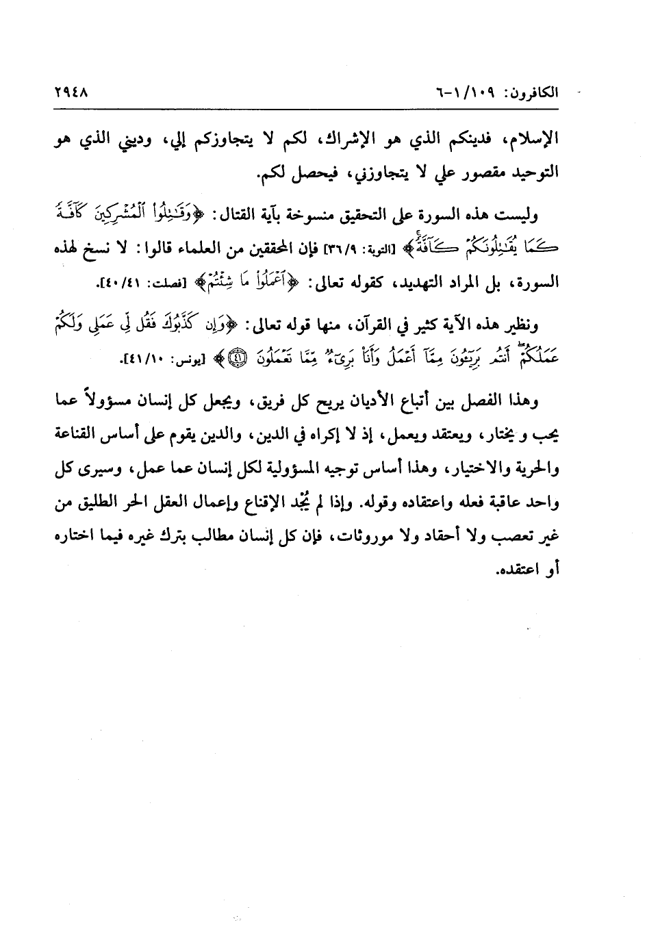 وليست هذه السورة على التحقيق منسوخة بآية القتال: وَقاتِلُوا الْمُشْرِكِينَ كَافَّةً كَما يُقاتِلُونَكُمْ كَافَّةً [التوبة: 9/ 36] فإن المحققين من العلماء قالوا: لا نسخ لهذه السورة، بل المراد التهديد، كقوله تعالى: اعْمَلُوا ما شِئْتُمْ [فصلت: 41/ 40] .