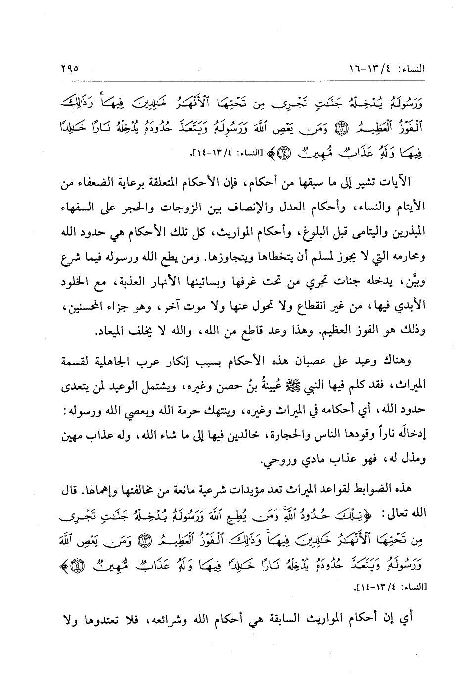 وهناك وعيد على عصيان هذه الأحكام بسبب إنكار عرب الجاهلية لقسمة الميراث، فقد كلم فيها النبي صلّى الله عليه وسلّم عيينة بن حصن وغيره، ويشتمل الوعيد لمن يتعدى حدود الله، أي أحكامه في الميراث وغيره، وينتهك حرمة الله ويعصي الله ورسوله: