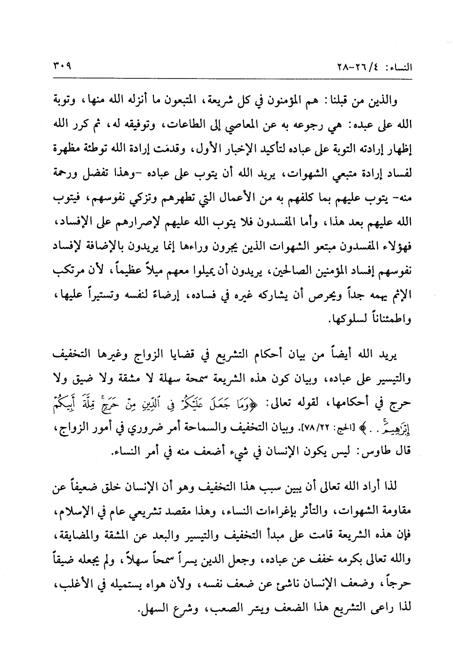 يريد الله أيضا من بيان أحكام التشريع في قضايا الزواج وغيرها التخفيف والتيسير على عباده، وبيان كون هذه الشريعة سمحة سهلة لا مشقة ولا ضيق ولا حرج في أحكامها، لقوله تعالى: وَما جَعَلَ عَلَيْكُمْ فِي الدِّينِ مِنْ حَرَجٍ مِلَّةَ أَبِيكُمْ إِبْراهِيمَ.. [الحج: 22/ 78] . وبيان التخفيف والسماحة أمر ضروري في أمور الزواج، قال طاوس: ليس يكون الإنسان في شيء أضعف منه في أمر النساء.