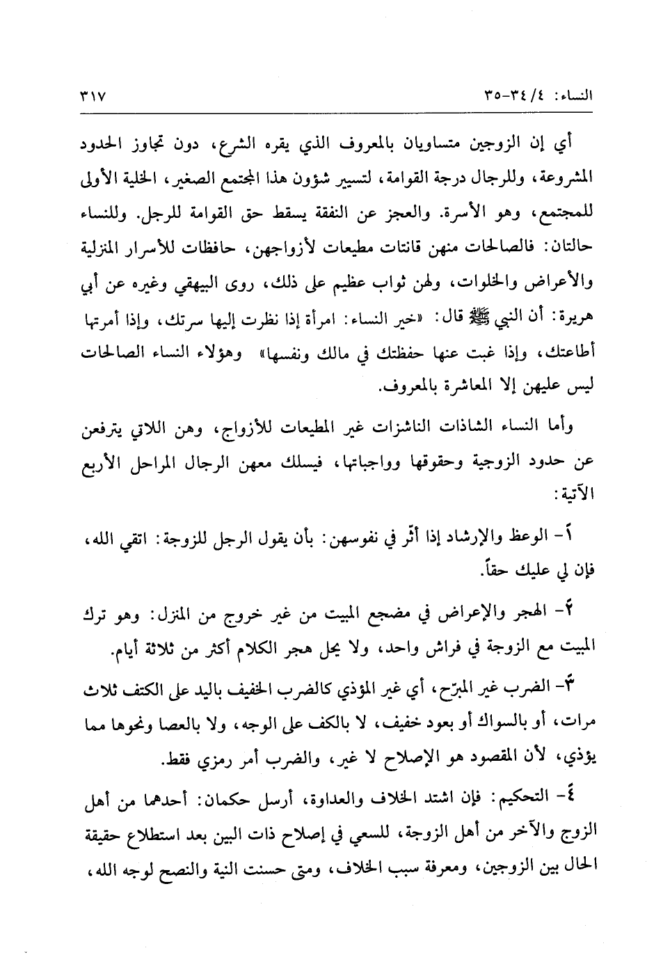 وأما النساء الشاذات الناشزات غير المطيعات للأزواج، وهن اللاتي يترفعن عن حدود الزوجية وحقوقها وواجباتها، فيسلك معهن الرجال المراحل الأربع الآتية: