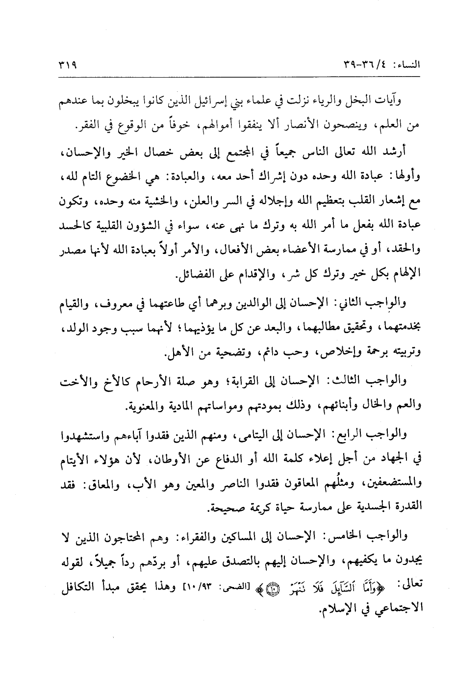 والواجب الخامس: الإحسان إلى المساكين والفقراء: وهم المحتاجون الذين لا يجدون ما يكفيهم، والإحسان إليهم بالتصدق عليهم، أو بردّهم ردا جميلا، لقوله تعالى: وَأَمَّا السَّائِلَ فَلا تَنْهَرْ (10) [الضحى: 93/ 10] وهذا يحقق مبدأ التكافل الاجتماعي في الإسلام.