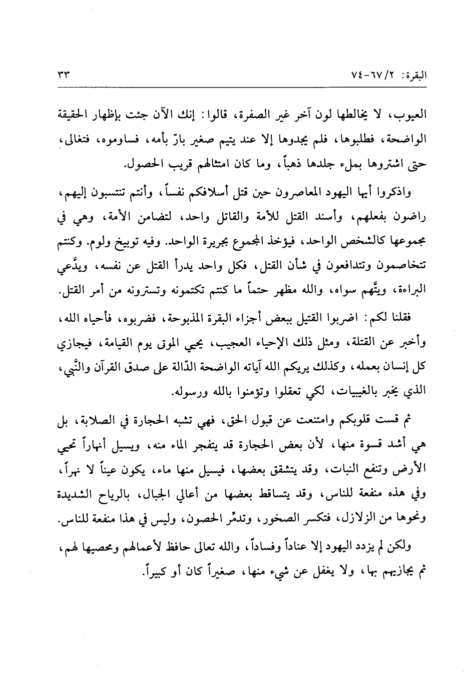 واذكروا أيها اليهود المعاصرون حين قتل أسلافكم نفسا، وأنتم تنتسبون إليهم، راضون بفعلهم، وأسند القتل للأمة والقاتل واحد، لتضامن الأمة، وهي في مجموعها كالشخص الواحد، فيؤخذ المجموع بجريرة الواحد. وفيه توبيخ ولوم. وكنتم تتخاصمون وتتدافعون في شأن القتل، فكل واحد يدرأ القتل عن نفسه، ويدّعي البراءة، ويتّهم سواه، والله مظهر حتما ما كنتم تكتمونه وتسترونه من أمر القتل.