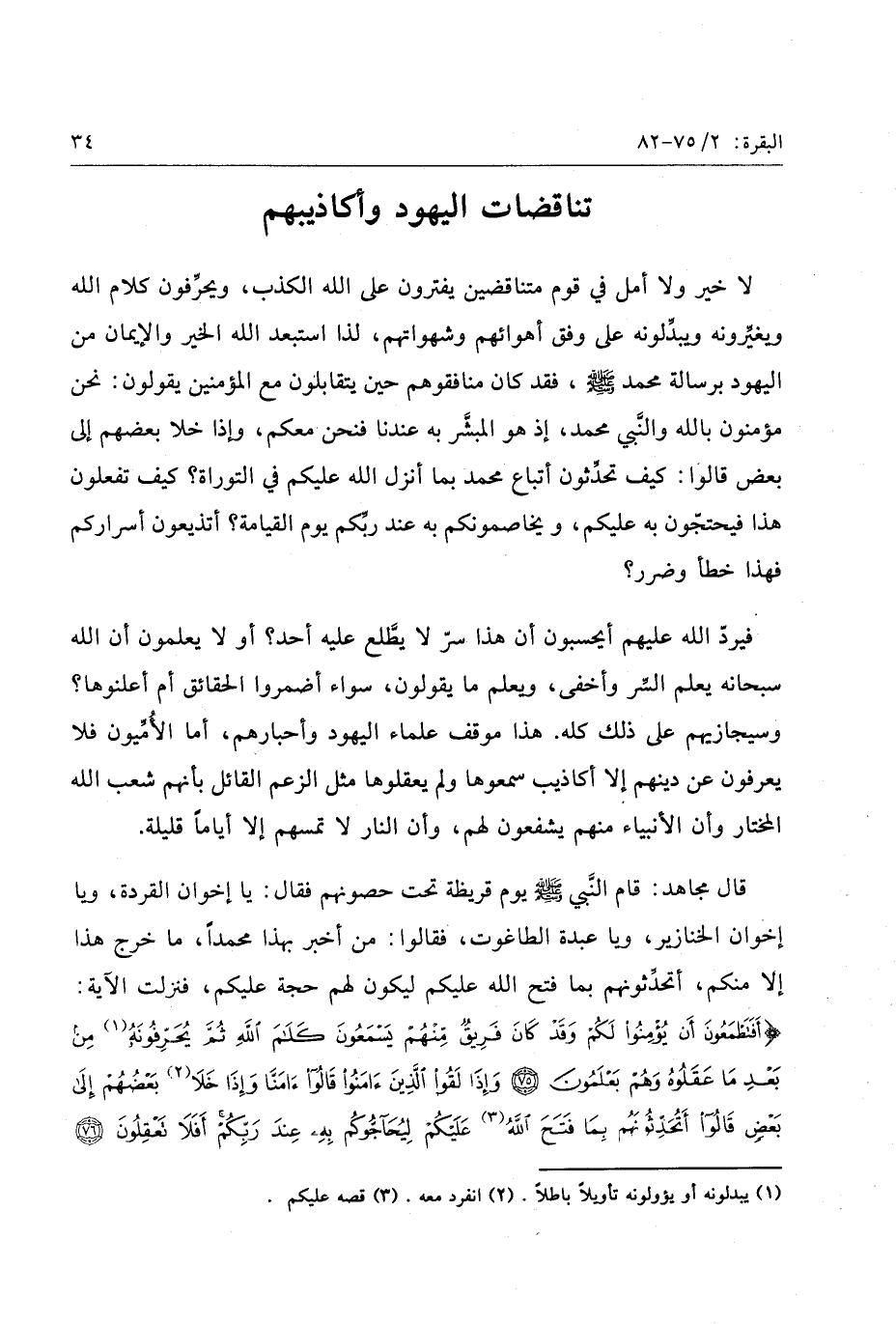 لا خير ولا أمل في قوم متناقضين يفترون على الله الكذب، ويحرّفون كلام الله ويغيّرونه ويبدّلونه على وفق أهوائهم وشهواتهم، لذا استبعد الله الخير والإيمان من اليهود برسالة محمد صلّى الله عليه وسلم، فقد كان منافقوهم حين يتقابلون مع المؤمنين يقولون: نحن مؤمنون بالله والنّبي محمد، إذ هو المبشّر به عندنا فنحن معكم، وإذا خلا بعضهم إلى بعض قالوا: كيف تحدّثون أتباع محمد بما أنزل الله عليكم في التوراة؟ كيف تفعلون هذا فيحتجّون به عليكم، ويخاصمونكم به عند ربّكم يوم القيامة؟ أتذيعون أسراركم فهذا خطأ وضرر؟