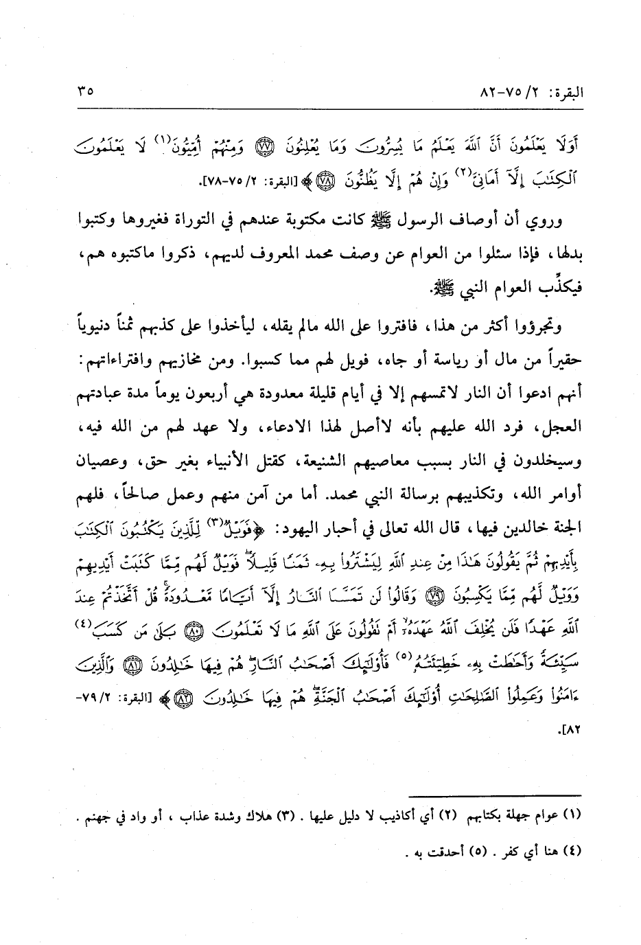 فَوَيْلٌ لِلَّذِينَ يَكْتُبُونَ الْكِتابَ بِأَيْدِيهِمْ ثُمَّ يَقُولُونَ هذا مِنْ عِنْدِ اللَّهِ لِيَشْتَرُوا بِهِ ثَمَناً قَلِيلاً فَوَيْلٌ لَهُمْ مِمَّا كَتَبَتْ أَيْدِيهِمْ وَوَيْلٌ لَهُمْ مِمَّا يَكْسِبُونَ (79) وَقالُوا لَنْ تَمَسَّنَا النَّارُ إِلاَّ أَيَّاماً مَعْدُودَةً قُلْ أَتَّخَذْتُمْ عِنْدَ اللَّهِ عَهْداً فَلَنْ يُخْلِفَ اللَّهُ عَهْدَهُ أَمْ تَقُولُونَ عَلَى اللَّهِ ما لا تَعْلَمُونَ (80) بَلى مَنْ كَسَبَ سَيِّئَةً وَأَحاطَتْ بِهِ خَطِيئَتُهُ فَأُولئِكَ أَصْحابُ النَّارِ هُمْ فِيها خالِدُونَ (81) وَالَّذِينَ آمَنُوا وَعَمِلُوا الصَّالِحاتِ أُولئِكَ أَصْحابُ الْجَنَّةِ هُمْ فِيها خالِدُونَ (82)