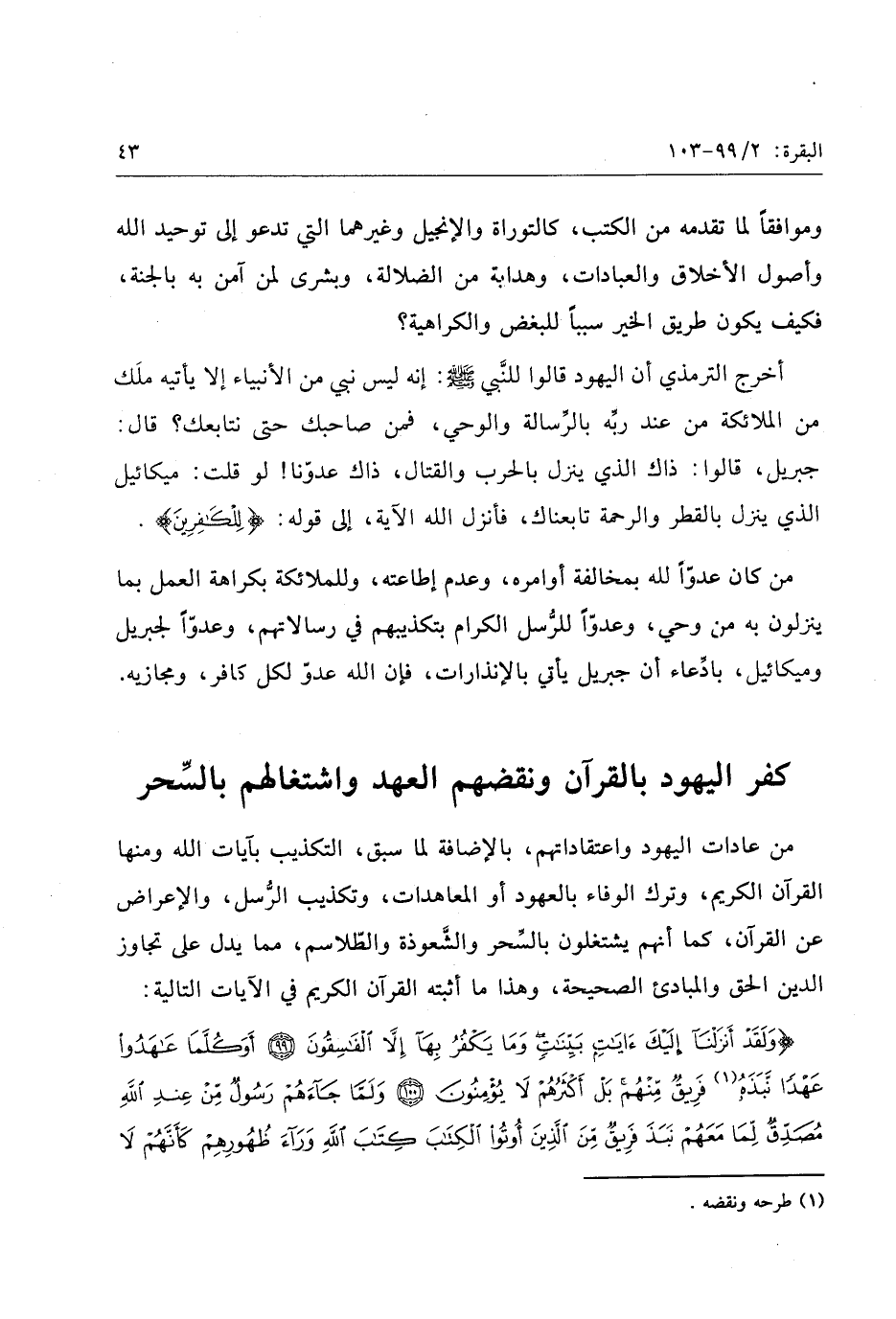 وَلَقَدْ أَنْزَلْنا إِلَيْكَ آياتٍ بَيِّناتٍ وَما يَكْفُرُ بِها إِلاَّ الْفاسِقُونَ (99) أَوَكُلَّما عاهَدُوا عَهْداً نَبَذَهُ فَرِيقٌ مِنْهُمْ بَلْ أَكْثَرُهُمْ لا يُؤْمِنُونَ (100) وَلَمَّا جاءَهُمْ رَسُولٌ مِنْ عِنْدِ اللَّهِ مُصَدِّقٌ لِما مَعَهُمْ نَبَذَ فَرِيقٌ مِنَ الَّذِينَ أُوتُوا الْكِتابَ كِتابَ اللَّهِ وَراءَ ظُهُورِهِمْ كَأَنَّهُمْ لا يَعْلَمُونَ (101) وَاتَّبَعُوا ما تَتْلُوا الشَّياطِينُ عَلى مُلْكِ سُلَيْمانَ وَما كَفَرَ سُلَيْمانُ وَلكِنَّ الشَّياطِينَ كَفَرُوا يُعَلِّمُونَ النَّاسَ السِّحْرَ وَما أُنْزِلَ عَلَى الْمَلَكَيْنِ بِبابِلَ هارُوتَ وَمارُوتَ وَما يُعَلِّمانِ مِنْ أَحَدٍ حَتَّى يَقُولا إِنَّما نَحْنُ فِتْنَةٌ فَلا تَكْفُرْ فَيَتَعَلَّمُونَ مِنْهُما ما يُفَرِّقُونَ بِهِ بَيْنَ الْمَرْءِ وَزَوْجِهِ وَما هُمْ بِضارِّينَ بِهِ مِنْ أَحَدٍ إِلاَّ بِإِذْنِ اللَّهِ وَيَتَعَلَّمُونَ ما يَضُرُّهُمْ وَلا يَنْفَعُهُمْ وَلَقَدْ عَلِمُوا لَمَنِ اشْتَراهُ ما لَهُ فِي الْآخِرَةِ مِنْ خَلاقٍ وَلَبِئْسَ ما شَرَوْا بِهِ أَنْفُسَهُمْ لَوْ كانُوا يَعْلَمُونَ (102) وَلَوْ أَنَّهُمْ آمَنُوا وَاتَّقَوْا لَمَثُوبَةٌ مِنْ عِنْدِ اللَّهِ خَيْرٌ لَوْ كانُوا يَعْلَمُونَ (103)