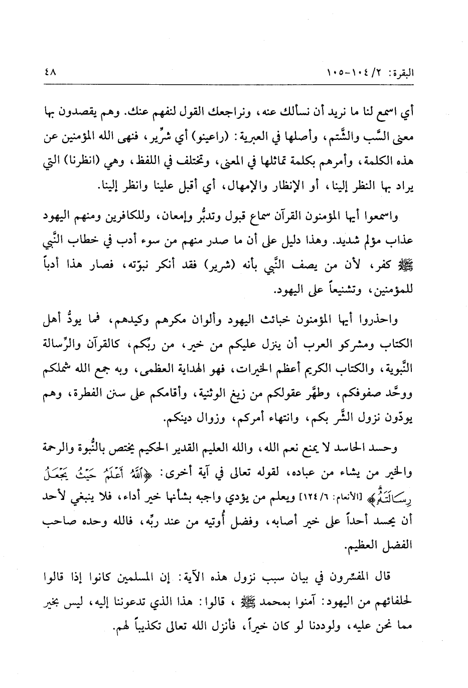 واحذروا أيها المؤمنون خبائث اليهود وألوان مكرهم وكيدهم، فما يودّ أهل الكتاب ومشركو العرب أن ينزل عليكم من خير، من ربّكم، كالقرآن والرّسالة النّبوية، والكتاب الكريم أعظم الخيرات، فهو الهداية العظمى، وبه جمع الله شملكم ووحّد صفوفكم، وطهّر عقولكم من زيغ الوثنية، وأقامكم على سنن الفطرة، وهم يودّون نزول الشّر بكم، وانتهاء أمركم، وزوال دينكم.