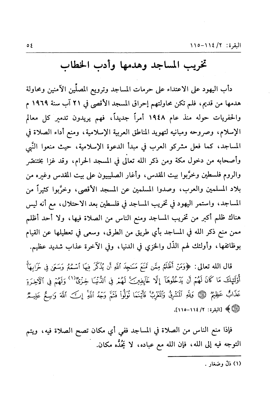 دأب اليهود على الاعتداء على حرمات المساجد وترويع المصلّين الآمنين ومحاولة هدمها من قديم، فلم تكن محاولتهم إحراق المسجد الأقصى في 21 آب سنة 1969 م والحفريات حوله منذ عام 1948 أمرا جديدا، فهم يريدون تدمير كل معالم الإسلام، وصروحه ومبانيه لتهويد المناطق العربية الإسلامية، ومنع أداء الصلاة في المساجد، كما فعل مشركو العرب في مبدأ الدعوة الإسلامية، حيث منعوا النّبي وأصحابه من دخول مكة ومن ذكر الله تعالى في المسجد الحرام، وقد غزا بختنصّر والروم فلسطين وخرّبوا بيت المقدس، وأغار الصليبيون على بيت المقدس وغيره من بلاد المسلمين والعرب، وصدوا المسلمين عن المسجد الأقصى، وخرّبوا كثيرا من المساجد، واستمر اليهود في تخريب المساجد في فلسطين بعد الاحتلال، مع أنه ليس هناك ظلم أكبر من تخريب المساجد ومنع الناس من الصلاة فيها، ولا أحد أظلم ممن منع ذكر الله في المساجد بأي طريق من الطرق، وسعى في تعطيلها عن القيام بوظائفها، وأولئك لهم الذّل والخزي في الدنيا، وفي الآخرة عذاب شديد عظيم.