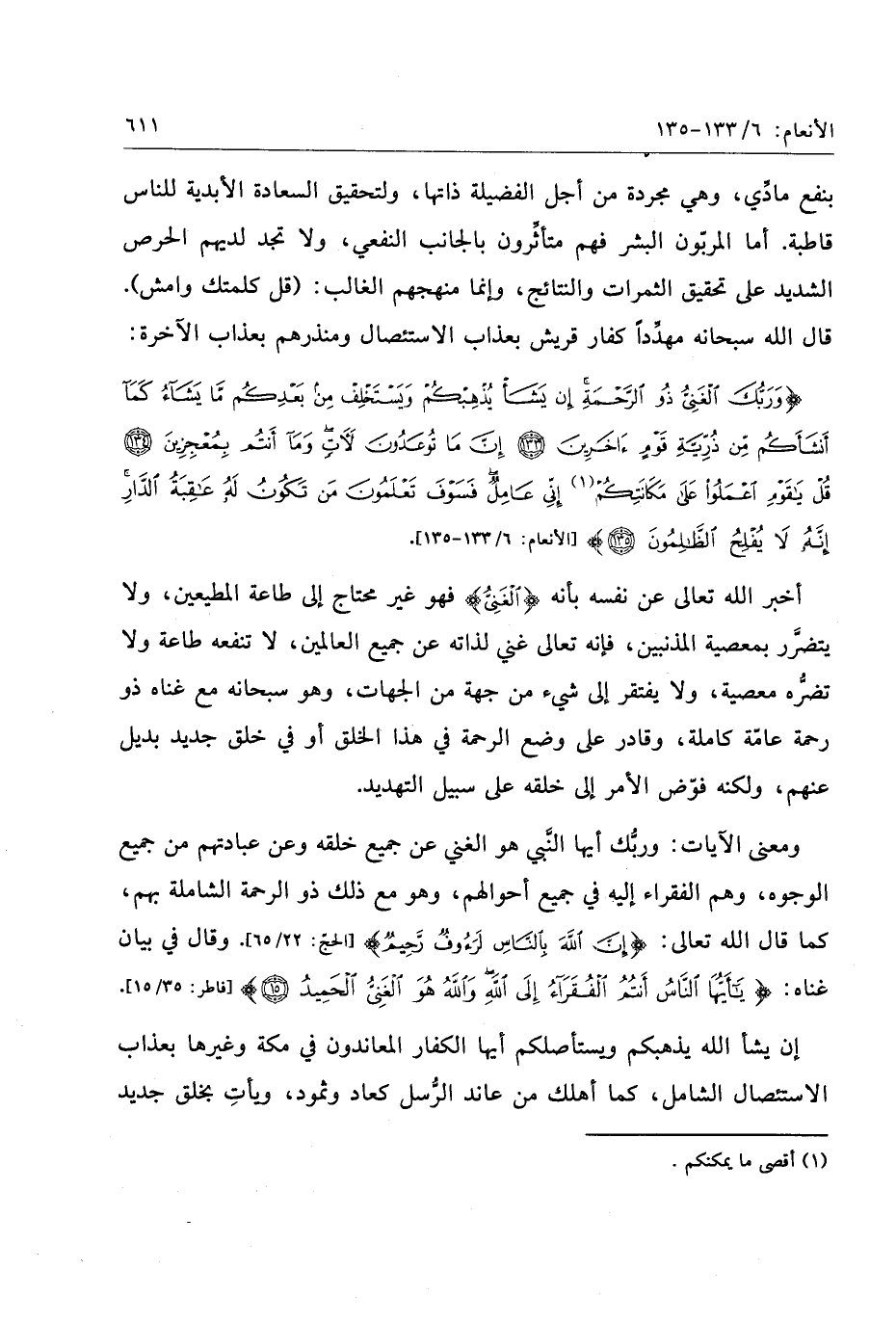 ومعنى الآيات: وربّك أيها النّبي هو الغني عن جميع خلقه وعن عبادتهم من جميع الوجوه، وهم الفقراء إليه في جميع أحوالهم، وهو مع ذلك ذو الرحمة الشاملة بهم، كما قال الله تعالى: إِنَّ اللَّهَ بِالنَّاسِ لَرَؤُفٌ رَحِيمٌ [الحجّ: 22/ 65] . وقال في بيان غناه: يا أَيُّهَا النَّاسُ أَنْتُمُ الْفُقَراءُ إِلَى اللَّهِ وَاللَّهُ هُوَ الْغَنِيُّ الْحَمِيدُ (15) [فاطر: 35/ 15] .