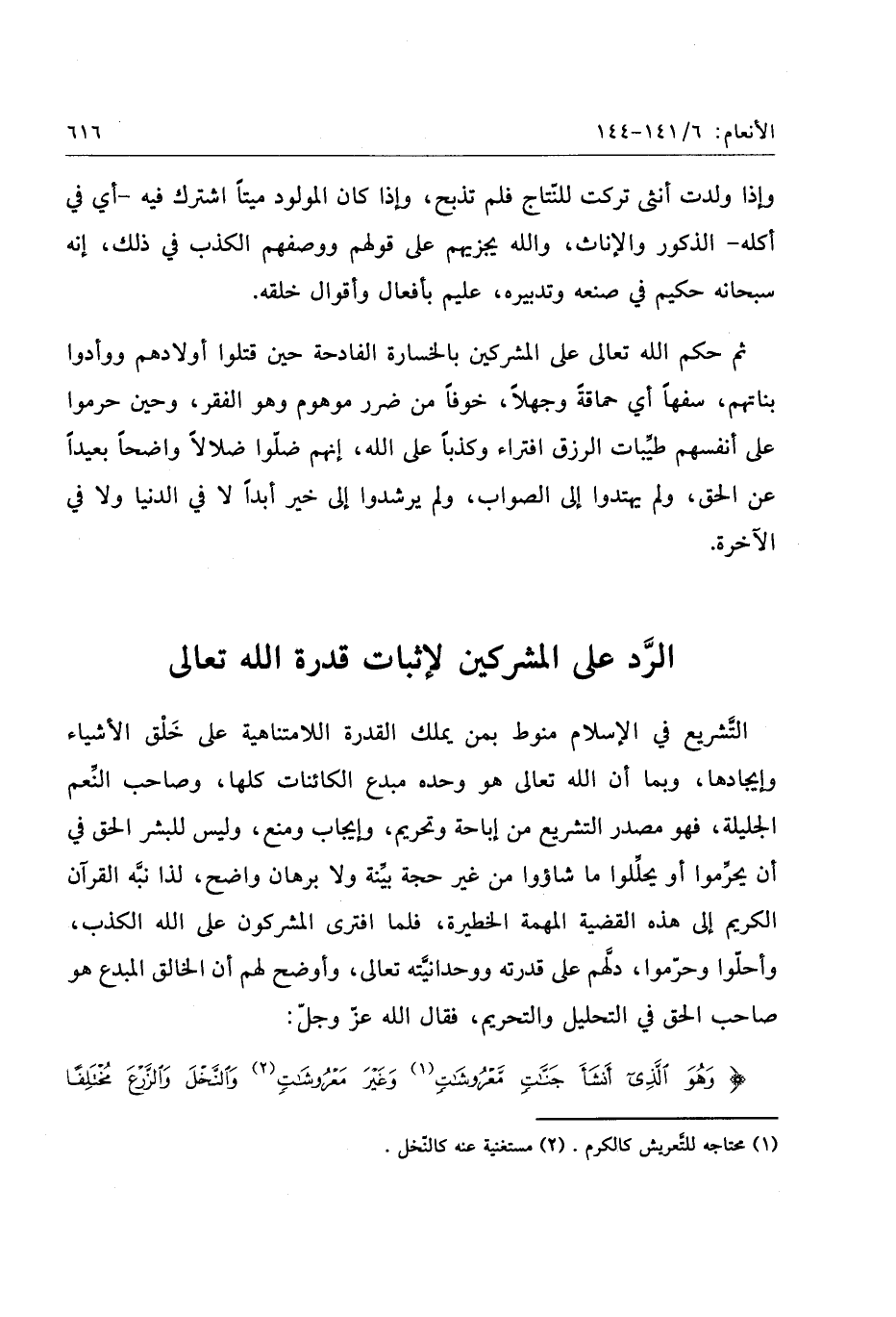 وَهُوَ الَّذِي أَنْشَأَ جَنَّاتٍ مَعْرُوشاتٍ وَغَيْرَ مَعْرُوشاتٍ وَالنَّخْلَ وَالزَّرْعَ مُخْتَلِفاً أُكُلُهُ وَالزَّيْتُونَ وَالرُّمَّانَ مُتَشابِهاً وَغَيْرَ مُتَشابِهٍ كُلُوا مِنْ ثَمَرِهِ إِذا أَثْمَرَ وَآتُوا حَقَّهُ يَوْمَ حَصادِهِ وَلا تُسْرِفُوا إِنَّهُ لا يُحِبُّ الْمُسْرِفِينَ (141) وَمِنَ الْأَنْعامِ حَمُولَةً وَفَرْشاً كُلُوا مِمَّا رَزَقَكُمُ اللَّهُ وَلا تَتَّبِعُوا خُطُواتِ الشَّيْطانِ إِنَّهُ لَكُمْ عَدُوٌّ مُبِينٌ (142) ثَمانِيَةَ أَزْواجٍ مِنَ الضَّأْنِ اثْنَيْنِ وَمِنَ الْمَعْزِ اثْنَيْنِ قُلْ آلذَّكَرَيْنِ حَرَّمَ أَمِ الْأُنْثَيَيْنِ أَمَّا اشْتَمَلَتْ عَلَيْهِ أَرْحامُ الْأُنْثَيَيْنِ نَبِّئُونِي بِعِلْمٍ إِنْ كُنْتُمْ صادِقِينَ (143) وَمِنَ الْإِبِلِ اثْنَيْنِ وَمِنَ الْبَقَرِ اثْنَيْنِ قُلْ آلذَّكَرَيْنِ حَرَّمَ أَمِ الْأُنْثَيَيْنِ أَمَّا اشْتَمَلَتْ عَلَيْهِ أَرْحامُ الْأُنْثَيَيْنِ أَمْ كُنْتُمْ شُهَداءَ إِذْ وَصَّاكُمُ اللَّهُ بِهذا فَمَنْ أَظْلَمُ مِمَّنِ افْتَرى عَلَى اللَّهِ كَذِباً لِيُضِلَّ النَّاسَ بِغَيْرِ عِلْمٍ إِنَّ اللَّهَ لا يَهْدِي الْقَوْمَ الظَّالِمِينَ (144)