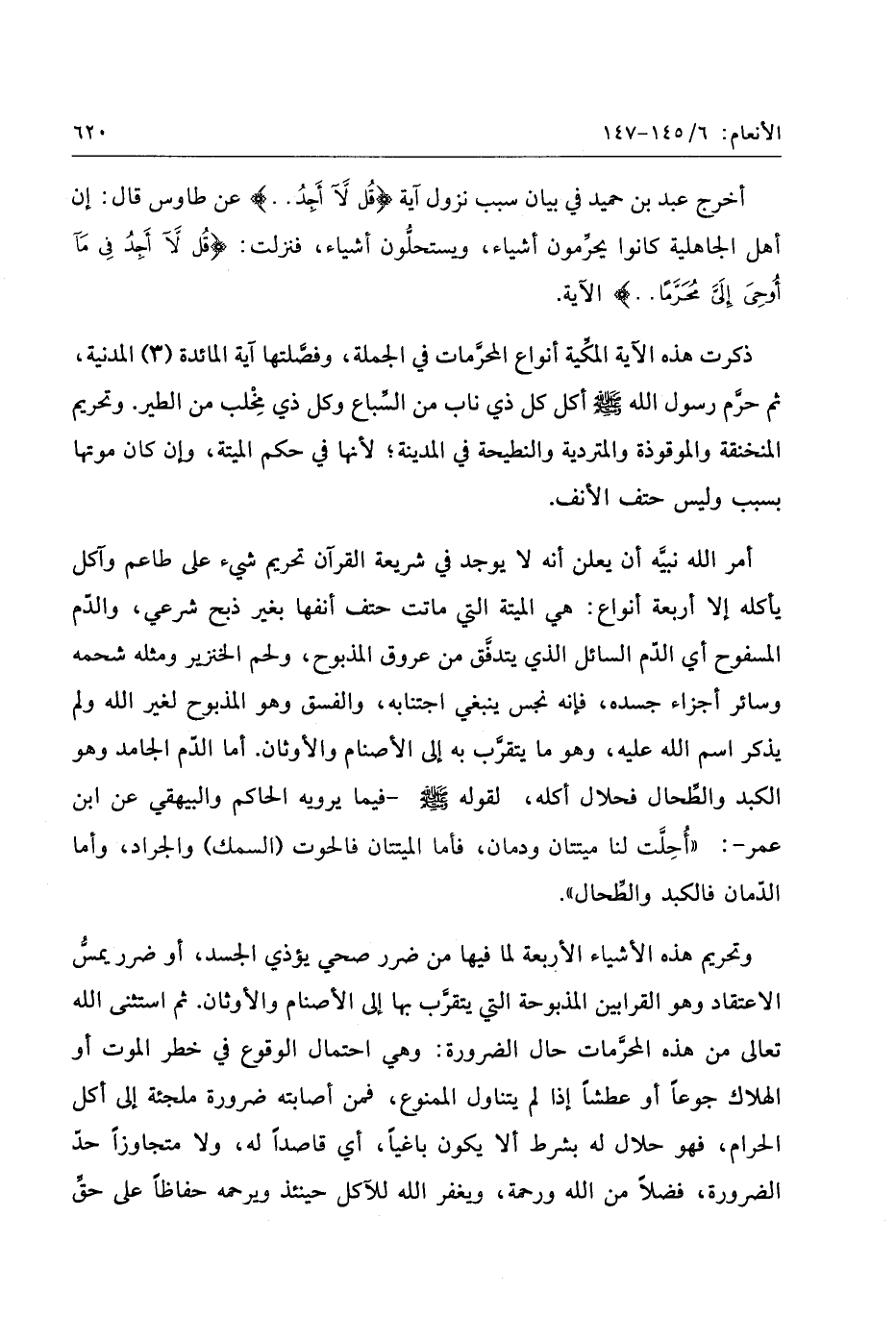 أمر الله نبيّه أن يعلن أنه لا يوجد في شريعة القرآن تحريم شيء على طاعم وآكل يأكله إلا أربعة أنواع: هي الميتة التي ماتت حتف أنفها بغير ذبح شرعي، والدّم المسفوح أي الدّم السائل الذي يتدفّق من عروق المذبوح، ولحم الخنزير ومثله شحمه وسائر أجزاء جسده، فإنه نجس ينبغي اجتنابه، والفسق وهو المذبوح لغير الله ولم يذكر اسم الله عليه، وهو ما يتقرّب به إلى الأصنام والأوثان. أما الدّم الجامد وهو الكبد والطّحال فحلال أكله،