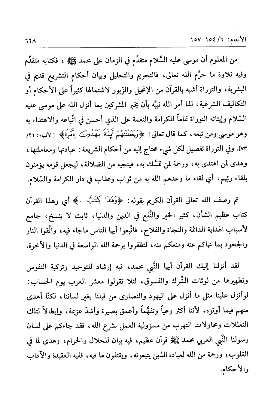 لو أنزل علينا مثل ما أنزل على اليهود والنصارى من قبلنا بغير لساننا، لكنّا أهدى منهم فيما أوتوه، لأننا أكثر وعيا وتفهّما وأعمق بصيرة وأشدّ عزيمة، وإبطالا لتلك التعللات ومحاولات التهرب من مسئولية العمل بشرع الله، فقد جاءكم على لسان رسولنا النّبي العربي محمد صلّى الله عليه وسلّم قرآن عظيم، فيه بيان للحلال والحرام، وهدى لما في القلوب، ورحمة من الله لعباده الذين يتبعونه، ويقتفون ما فيه، ففيه العقيدة والآداب والأحكام.