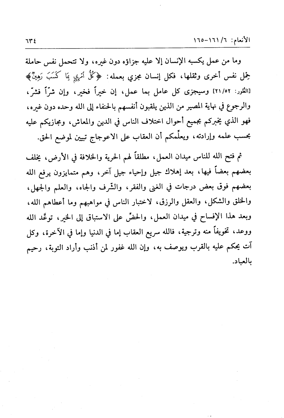 ثم فتح الله للناس ميدان العمل، مطلقا لهم الحرية والخلافة في الأرض، يخلف بعضهم بعضا فيها، بعد إهلاك جيل وإحياء جيل آخر، وهم متمايزون يرفع الله بعضهم فوق بعض درجات في الغنى والفقر، والشّرف والجاه، والعلم والجهل، والخلق والشكل، والعقل والرزق، لاختبار الناس في مواهبهم وما أعطاهم الله، وبعد هذا الإفساح في ميدان العمل، والحضّ على الاستباق إلى الخير، توعّد الله ووعد، تخويفا منه وترجية، فالله سريع العقاب إما في الدنيا وإما في الآخرة، وكل آت يحكم عليه بالقرب ويوصف به، وإن الله غفور لمن أذنب وأراد التوبة، رحيم بالعباد.