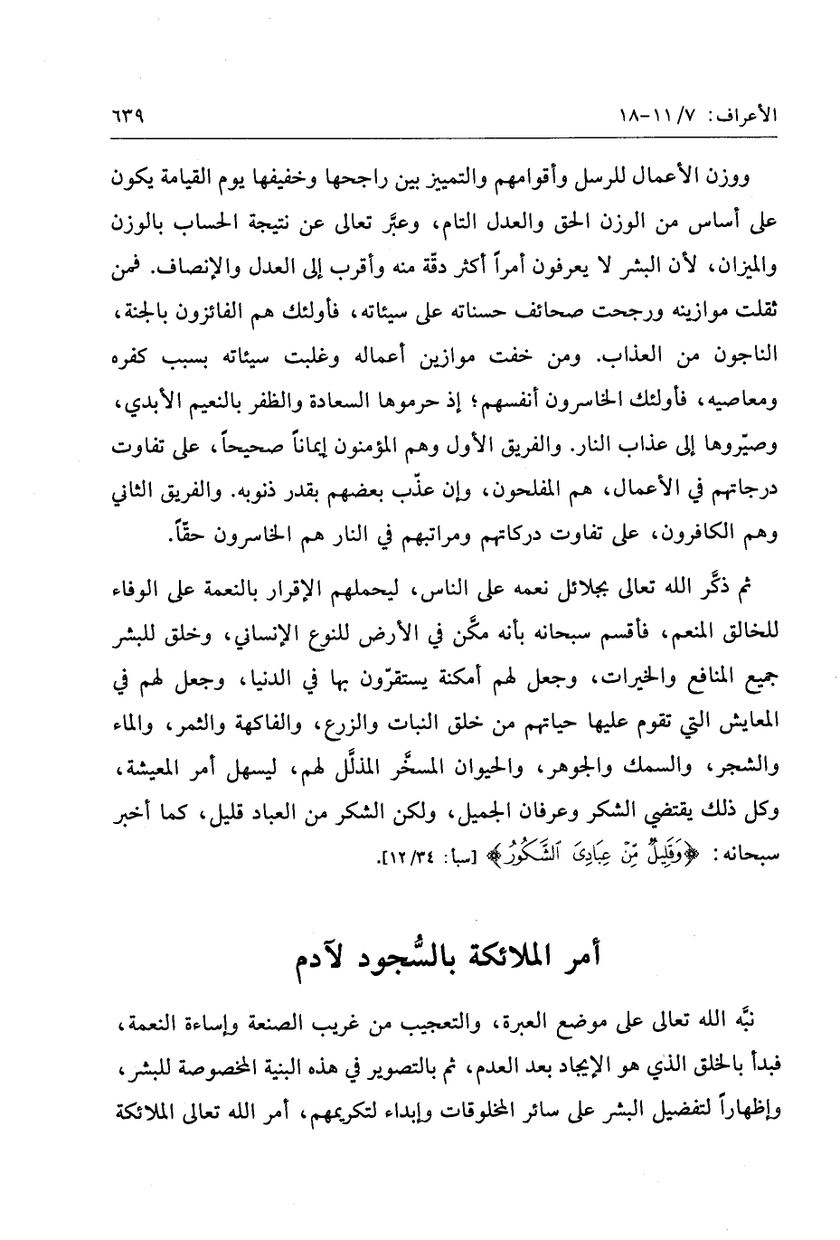 ووزن الأعمال للرسل وأقوامهم والتمييز بين راجحها وخفيفها يوم القيامة يكون على أساس من الوزن الحق والعدل التام، وعبّر تعالى عن نتيجة الحساب بالوزن والميزان، لأن البشر لا يعرفون أمرا أكثر دقّة منه وأقرب إلى العدل والإنصاف. فمن ثقلت موازينه ورجحت صحائف حسناته على سيئاته، فأولئك هم الفائزون بالجنة، الناجون من العذاب. ومن خفت موازين أعماله وغلبت سيئاته بسبب كفره ومعاصيه، فأولئك الخاسرون أنفسهم إذ حرموها السعادة والظفر بالنعيم الأبدي، وصيّروها إلى عذاب النار. والفريق الأول وهم المؤمنون إيمانا صحيحا، على تفاوت درجاتهم في الأعمال، هم المفلحون، وإن عذّب بعضهم بقدر ذنوبه. والفريق الثاني وهم الكافرون، على تفاوت دركاتهم ومراتبهم في النار هم الخاسرون حقّا.