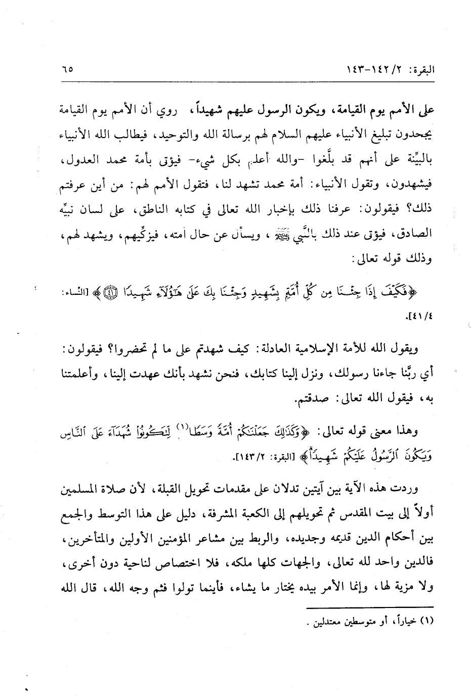 وهذا معنى قوله تعالى: وَكَذلِكَ جَعَلْناكُمْ أُمَّةً وَسَطاً «1» لِتَكُونُوا شُهَداءَ عَلَى النَّاسِ وَيَكُونَ الرَّسُولُ عَلَيْكُمْ شَهِيداً [البقرة: 2/ 143] .