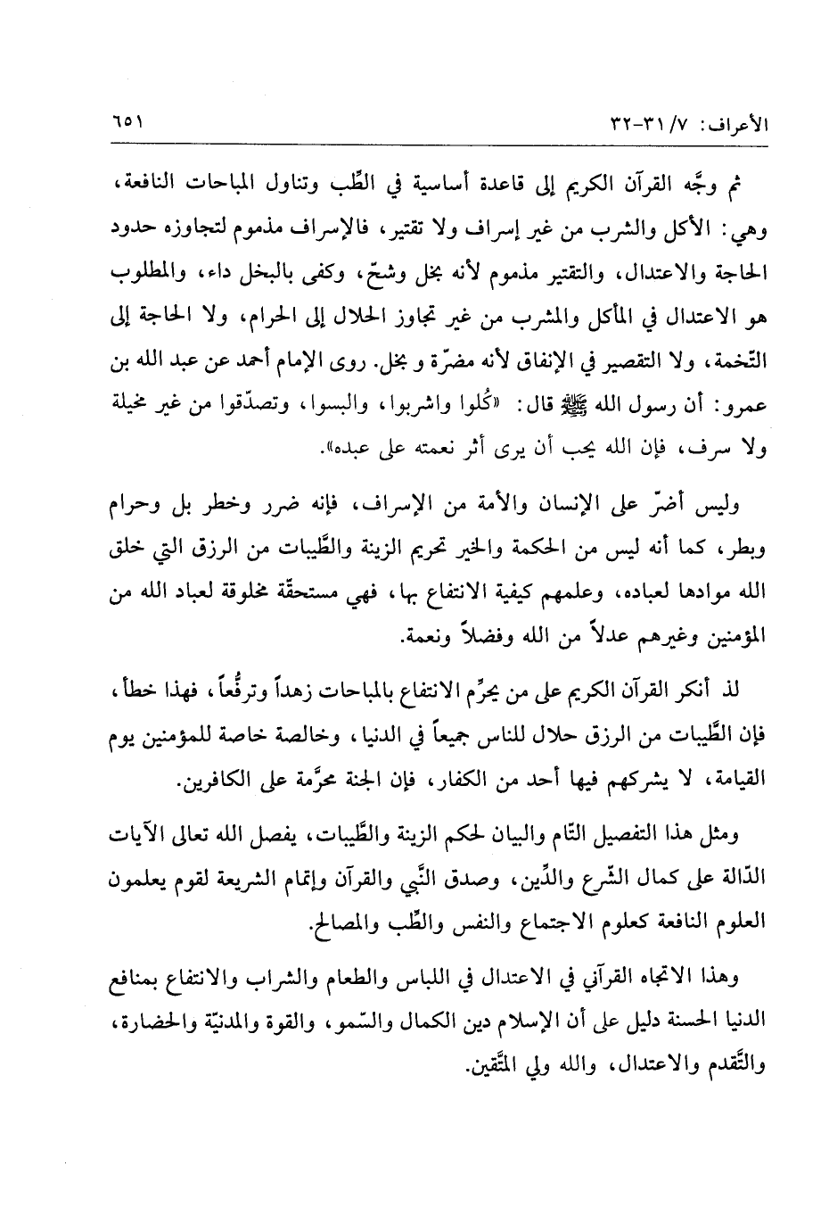 ثم وجّه القرآن الكريم إلى قاعدة أساسية في الطّب وتناول المباحات النافعة، وهي: الأكل والشرب من غير إسراف ولا تقتير، فالإسراف مذموم لتجاوزه حدود الحاجة والاعتدال، والتقتير مذموم لأنه بخل وشحّ، وكفى بالبخل داء، والمطلوب هو الاعتدال في المأكل والمشرب من غير تجاوز الحلال إلى الحرام، ولا الحاجة إلى التّخمة، ولا التقصير في الإنفاق لأنه مضرّة وبخل.