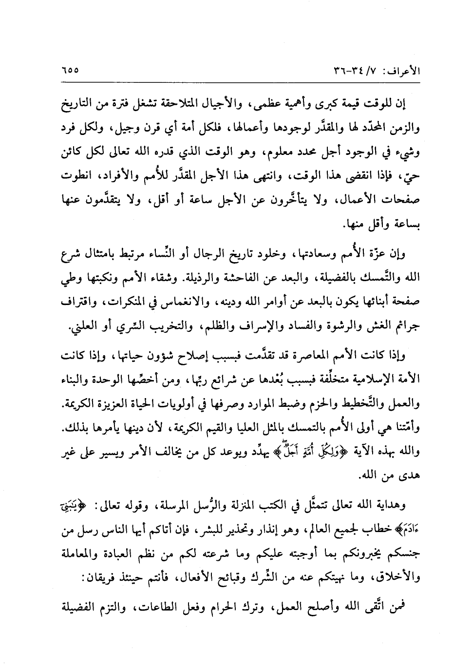 إن للوقت قيمة كبري وأهمية عظمي، والأجيال المتلاحقة تشغل فترة من التاريخ والزمن المحدّد لها والمقدّر لوجودها وأعمالها، فلكل أمة أي قرن وجيل، ولكل فرد وشيء في الوجود أجل محدد معلوم، وهو الوقت الذي قدره الله تعالى لكل كائن حيّ، فإذا انقضى هذا الوقت، وانتهى هذا الأجل المقدّر للأمم والأفراد، انطوت صفحات الأعمال، ولا يتأخّرون عن الأجل ساعة أو أقل، ولا يتقدّمون عنها بساعة وأقل منها.