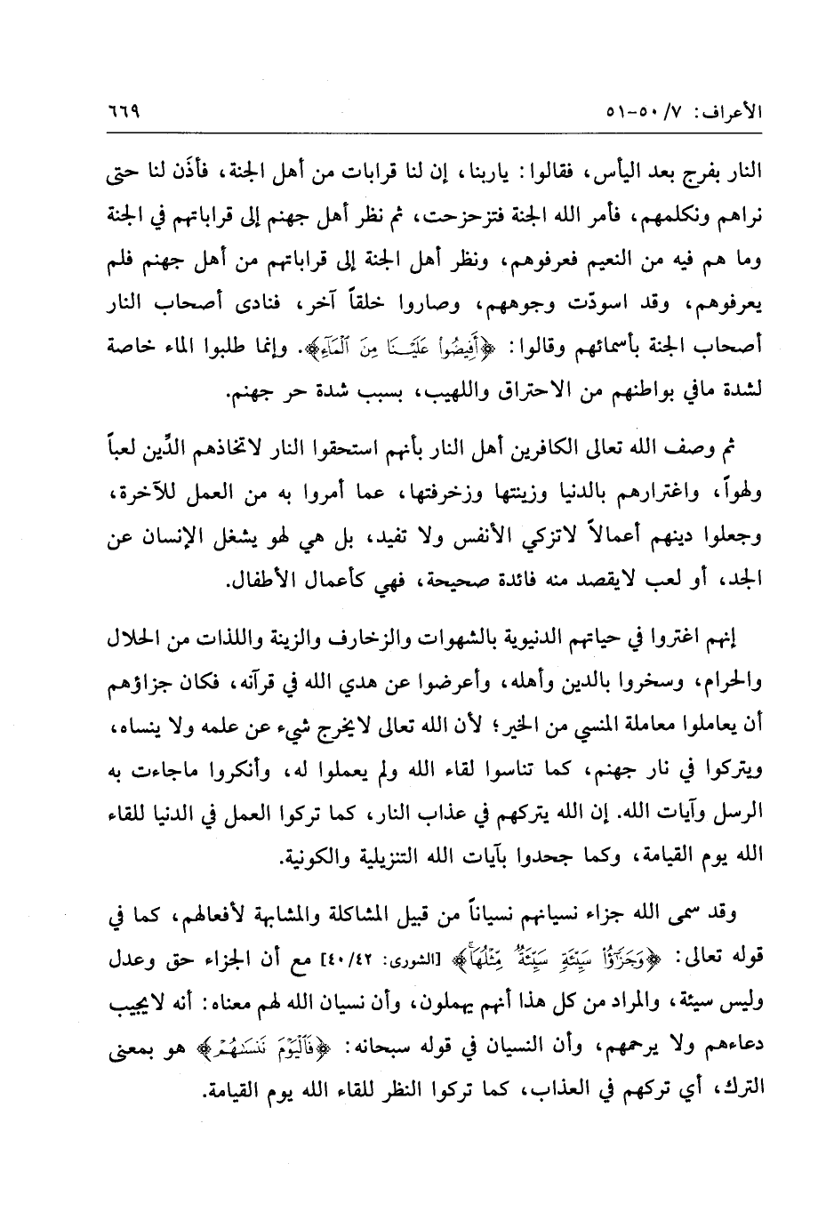 إنهم اغتروا في حياتهم الدنيوية بالشهوات والزخارف والزينة واللذات من الحلال والحرام، وسخروا بالدين وأهله، وأعرضوا عن هدي الله في قرآنه، فكان جزاؤهم أن يعاملوا معاملة المنسي من الخير لأن الله تعالى لا يخرج شيء عن علمه ولا ينساه، ويتركوا في نار جهنم، كما تناسوا لقاء الله ولم يعملوا له، وأنكروا ما جاءت به الرسل وآيات الله. إن الله يتركهم في عذاب النار، كما تركوا العمل في الدنيا للقاء الله يوم القيامة، وكما جحدوا بآيات الله التنزيلية والكونية.