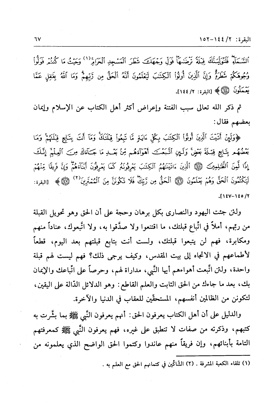 وَلَئِنْ أَتَيْتَ الَّذِينَ أُوتُوا الْكِتابَ بِكُلِّ آيَةٍ ما تَبِعُوا قِبْلَتَكَ وَما أَنْتَ بِتابِعٍ قِبْلَتَهُمْ وَما بَعْضُهُمْ بِتابِعٍ قِبْلَةَ بَعْضٍ وَلَئِنِ اتَّبَعْتَ أَهْواءَهُمْ مِنْ بَعْدِ ما جاءَكَ مِنَ الْعِلْمِ إِنَّكَ إِذاً لَمِنَ الظَّالِمِينَ (145) الَّذِينَ آتَيْناهُمُ الْكِتابَ يَعْرِفُونَهُ كَما يَعْرِفُونَ أَبْناءَهُمْ وَإِنَّ فَرِيقاً مِنْهُمْ لَيَكْتُمُونَ الْحَقَّ وَهُمْ يَعْلَمُونَ (146) الْحَقُّ مِنْ رَبِّكَ فَلا تَكُونَنَّ مِنَ الْمُمْتَرِينَ (147)