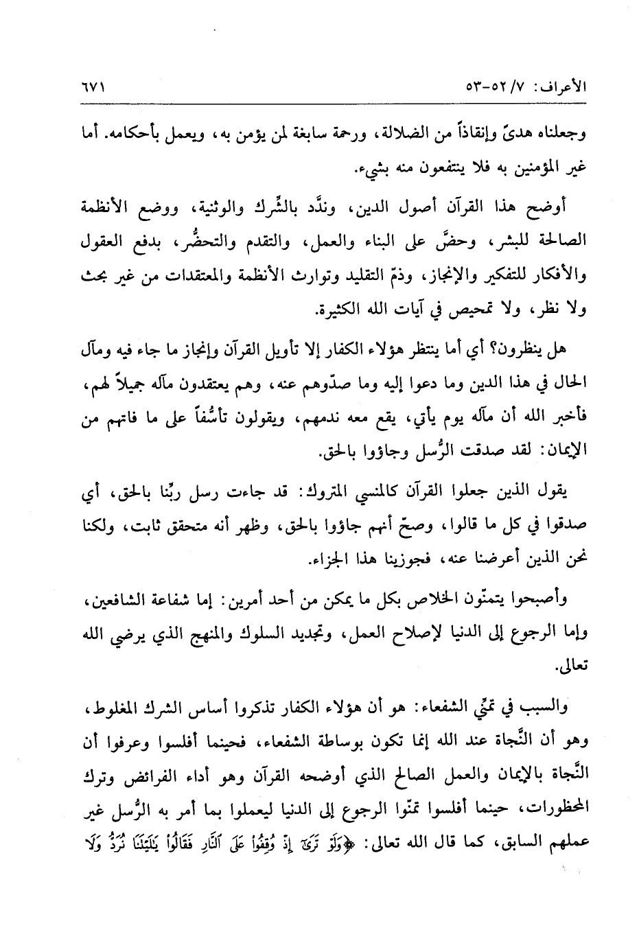 هل ينظرون؟ أي أما ينتظر هؤلاء الكفار إلا تأويل القرآن وإنجاز ما جاء فيه ومآل الحال في هذا الدين وما دعوا إليه وما صدّوهم عنه، وهم يعتقدون مآله جميلا لهم، فأخبر الله أن مآله يوم يأتي، يقع معه ندمهم، ويقولون تأسّفا على ما فاتهم من الإيمان: لقد صدقت الرّسل وجاؤوا بالحق.