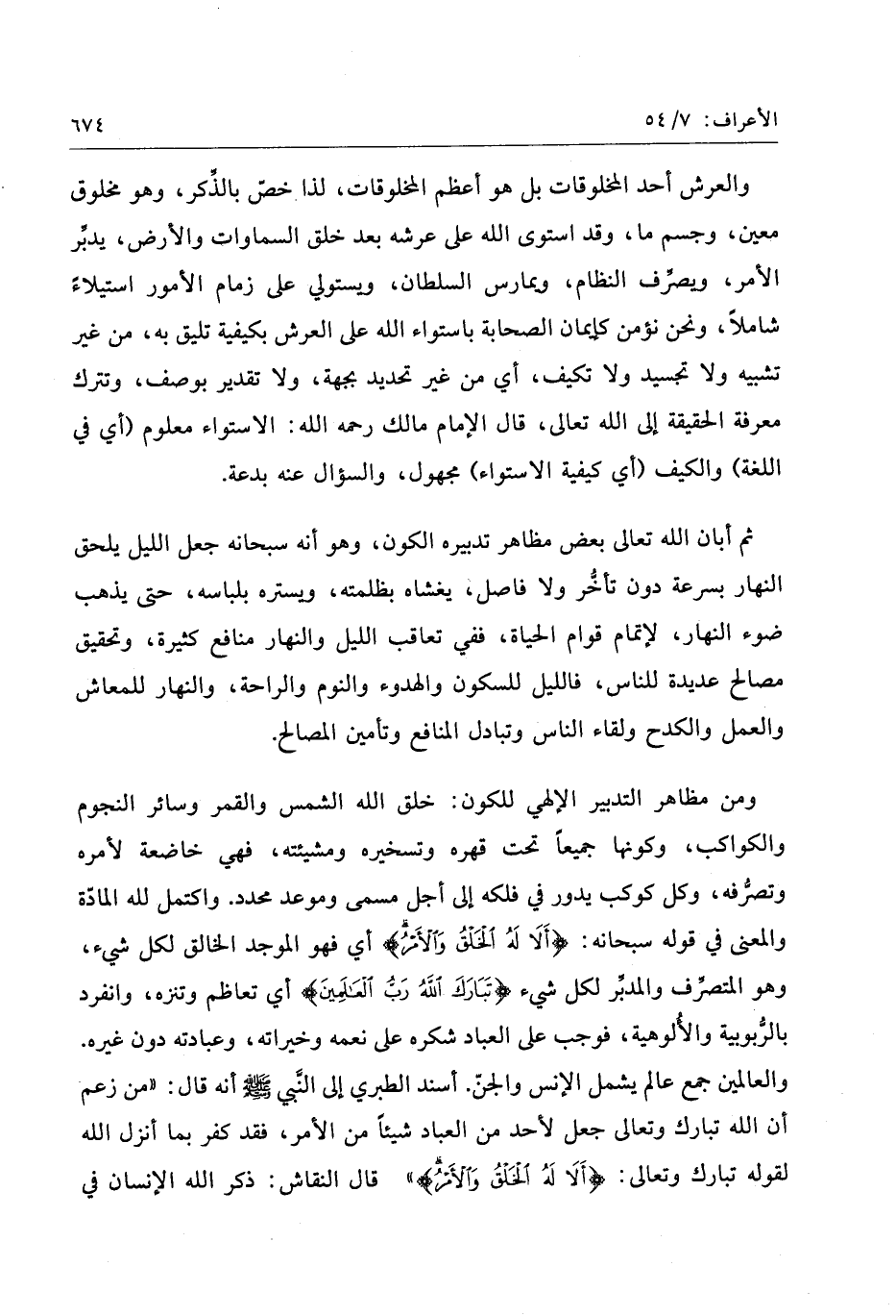 ومن مظاهر التدبير الإلهي للكون: خلق الله الشمس والقمر وسائر النجوم والكواكب، وكونها جميعا تحت قهره وتسخيره ومشيئته، فهي خاضعة لأمره وتصرّفه، وكل كوكب يدور في فلكه إلى أجل مسمى وموعد محدد. واكتمل لله المادّة والمعنى في قوله سبحانه: أَلا لَهُ الْخَلْقُ وَالْأَمْرُ أي فهو الموجد الخالق لكل شيء، وهو المتصرّف والمدبّر لكل شيء تَبارَكَ اللَّهُ رَبُّ الْعالَمِينَ أي تعاظم وتنزه، وانفرد بالرّبوبية والألوهية، فوجب على العباد شكره على نعمه وخيراته، وعبادته دون غيره.