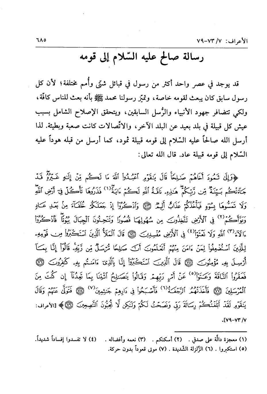 وَإِلى ثَمُودَ أَخاهُمْ صالِحاً قالَ يا قَوْمِ اعْبُدُوا اللَّهَ ما لَكُمْ مِنْ إِلهٍ غَيْرُهُ قَدْ جاءَتْكُمْ بَيِّنَةٌ مِنْ رَبِّكُمْ هذِهِ ناقَةُ اللَّهِ لَكُمْ آيَةً فَذَرُوها تَأْكُلْ فِي أَرْضِ اللَّهِ وَلا تَمَسُّوها بِسُوءٍ فَيَأْخُذَكُمْ عَذابٌ أَلِيمٌ (73) وَاذْكُرُوا إِذْ جَعَلَكُمْ خُلَفاءَ مِنْ بَعْدِ عادٍ وَبَوَّأَكُمْ فِي الْأَرْضِ تَتَّخِذُونَ مِنْ سُهُولِها قُصُوراً وَتَنْحِتُونَ الْجِبالَ بُيُوتاً فَاذْكُرُوا آلاءَ اللَّهِ وَلا تَعْثَوْا فِي الْأَرْضِ مُفْسِدِينَ (74) قالَ الْمَلَأُ الَّذِينَ اسْتَكْبَرُوا مِنْ قَوْمِهِ لِلَّذِينَ اسْتُضْعِفُوا لِمَنْ آمَنَ مِنْهُمْ أَتَعْلَمُونَ أَنَّ صالِحاً مُرْسَلٌ مِنْ رَبِّهِ قالُوا إِنَّا بِما أُرْسِلَ بِهِ مُؤْمِنُونَ (75) قالَ الَّذِينَ اسْتَكْبَرُوا إِنَّا بِالَّذِي آمَنْتُمْ بِهِ كافِرُونَ (76) فَعَقَرُوا النَّاقَةَ وَعَتَوْا عَنْ أَمْرِ رَبِّهِمْ وَقالُوا يا صالِحُ ائْتِنا بِما تَعِدُنا إِنْ كُنْتَ مِنَ الْمُرْسَلِينَ (77)
