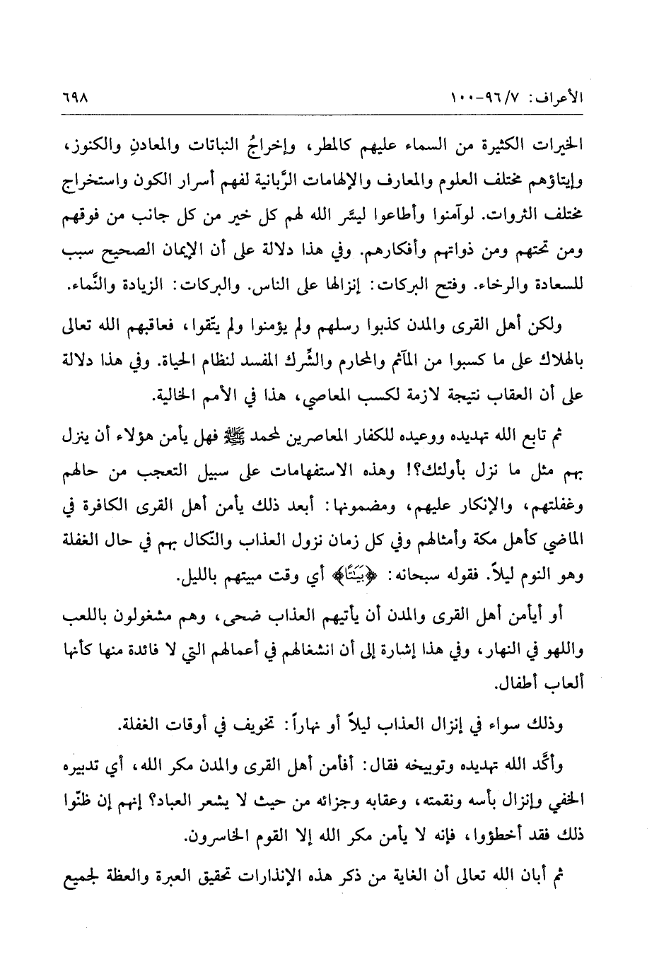 ولكن أهل القرى والمدن كذبوا رسلهم ولم يؤمنوا ولم يتّقوا، فعاقبهم الله تعالى بالهلاك على ما كسبوا من المآثم والمحارم والشّرك المفسد لنظام الحياة. وفي هذا دلالة على أن العقاب نتيجة لازمة لكسب المعاصي، هذا في الأمم الخالية.